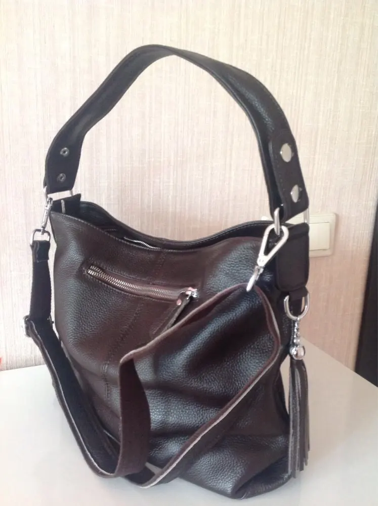 Хорошая сумка, кожа натуральная. Очень красивый цвет! Единственный недостаток - длинный ремень тряпочный, сверху тонкий ремешок из кожи а сам из тряпки. Очень не солидно и портит вид сумки, выглядит очень дёшево. если носить только с коротким ремешком то нет проблем. доставка до пункта выдачи очень быстрая. спасибо продавцу!