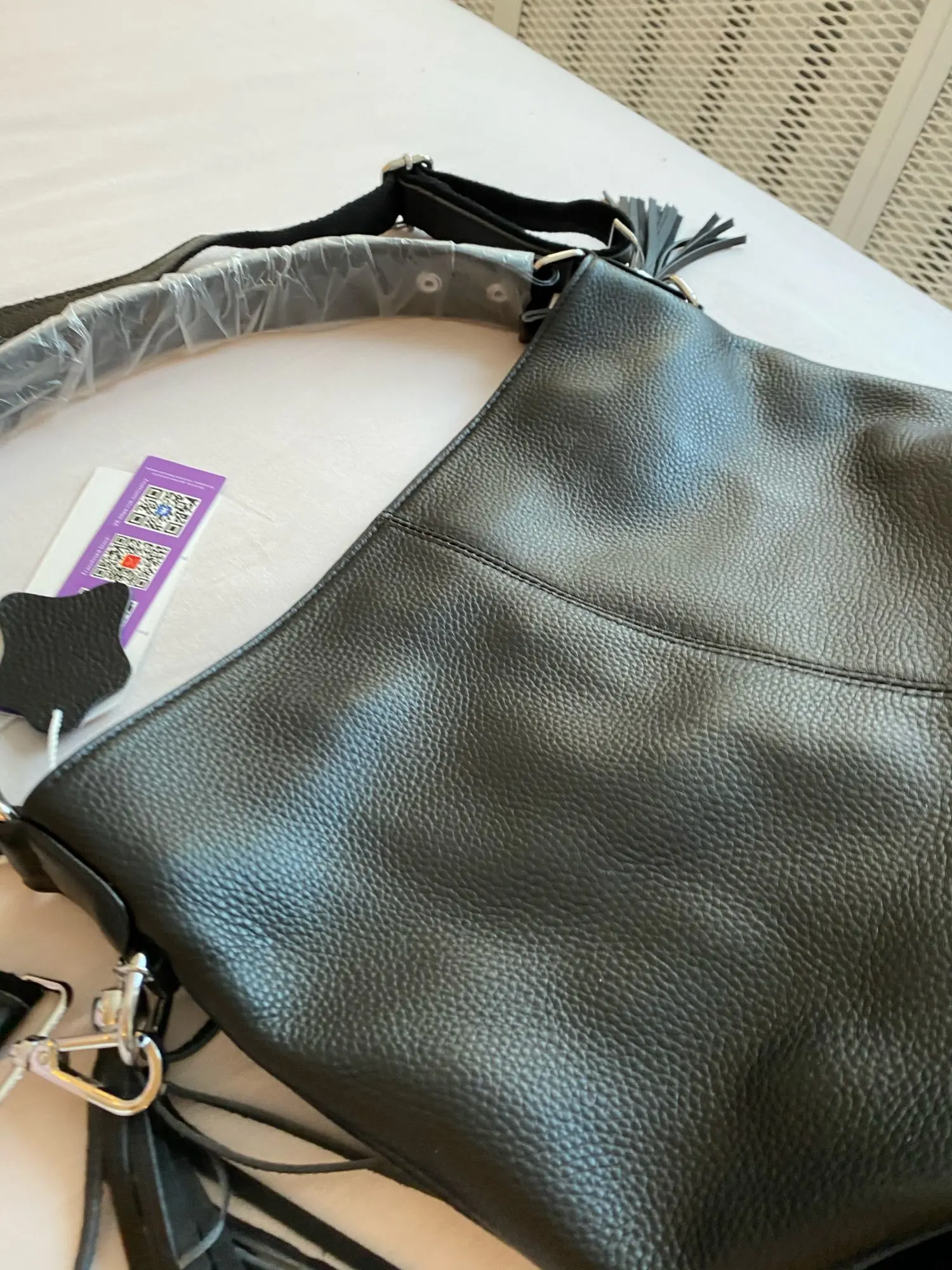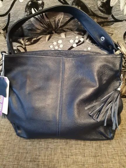 Очень понравилась. Кожаная, большая, мягкая. Есть длинный ремешок.