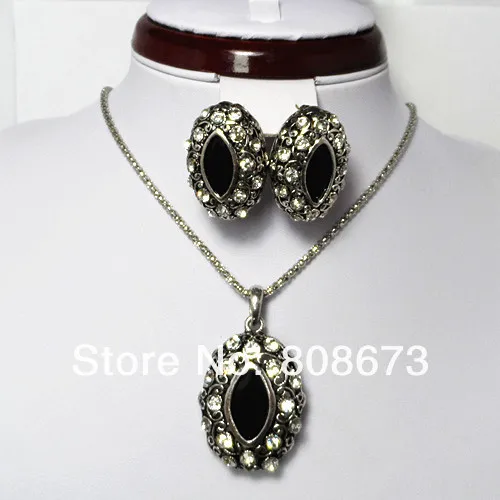 Винтажный серебряный тон Черный Кристалл Модное ожерелье из горного хрусталя и серьги комплект ювелирных изделий