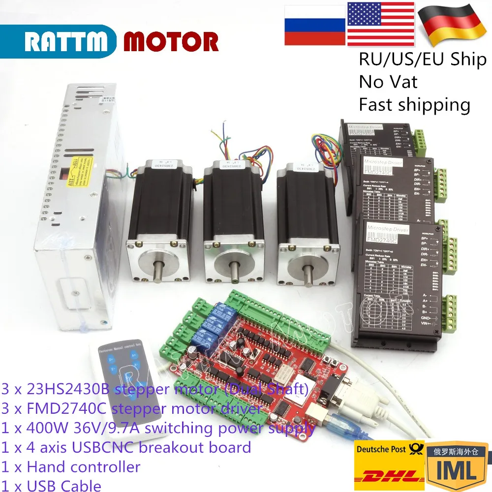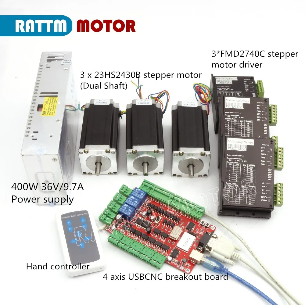 3-осевой контроллер ЧПУ Nema 23, комплект шагового двигателя (двойной вал) 112 мм, драйвер двигателя FMD2740C, источник питания постоянного тока 400 Вт и плата ЧПУ с USB