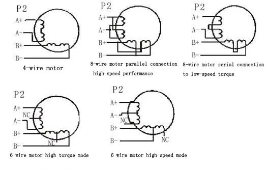 13,ЭлектропроводкаВ FMD2740C водитель может управлять всеми ток 4A 4-проводной, 6 проводов или 8-жильный 2-фазный/4-фазами, приводятся ниже 4-проводной, 6 проводов, 8 проводов шагового двигателя подключение: