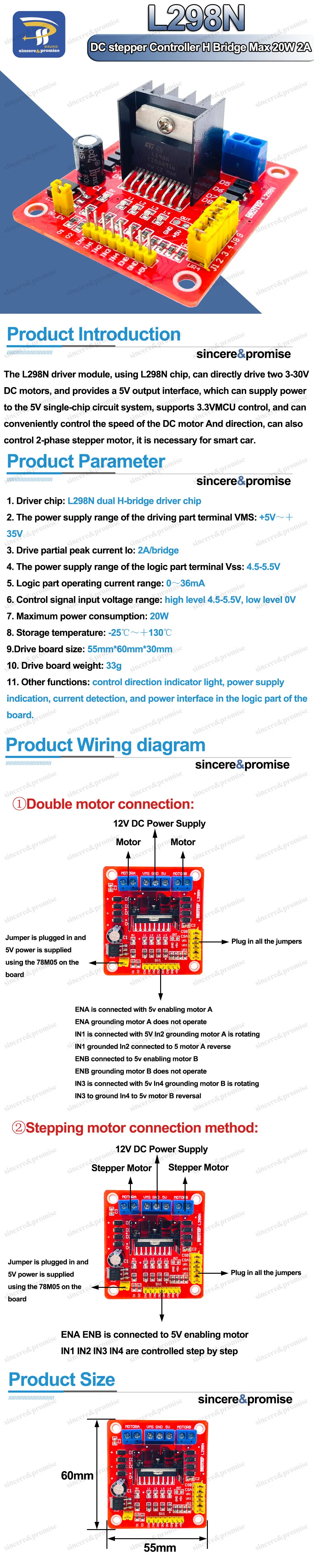 Модуль драйвера двигателя постоянного тока L298N, плата шагового двигателя, двойной мост H, макс. 20 Вт, 2 амост для Arduino