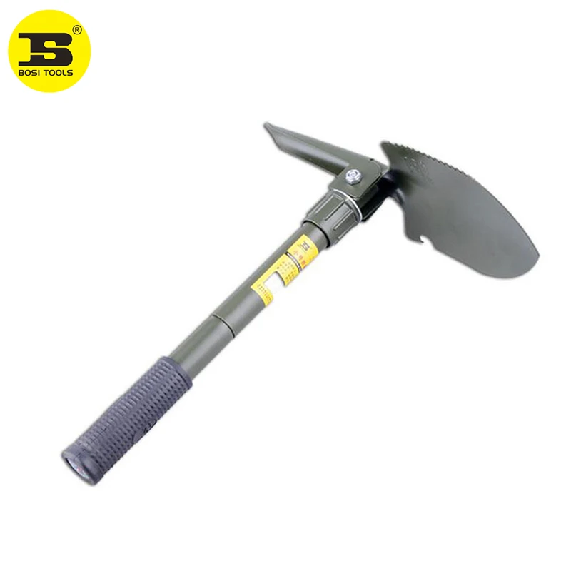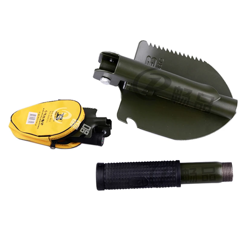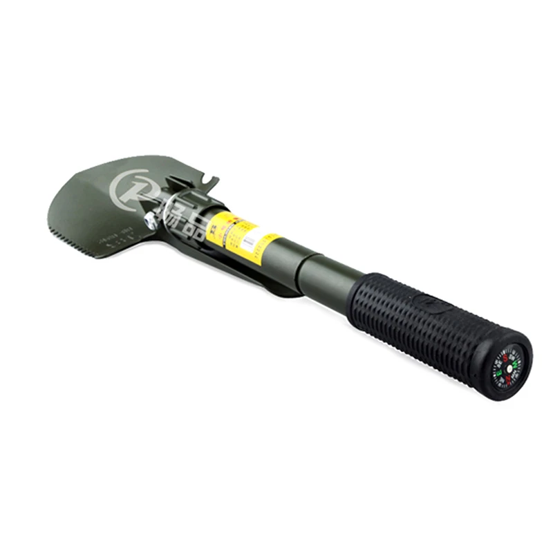 Лопата изготовлена из марганцевой стали, высокой твердости, окрашена распылением поверхности, ручка покрыта резиной и с компасом на конце, удобная ручка. Складывается в небольшую портативную сумку, которая очень хорошо подходит для кемпинга.