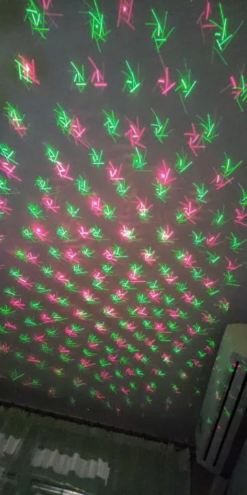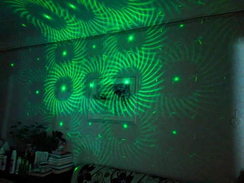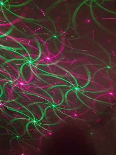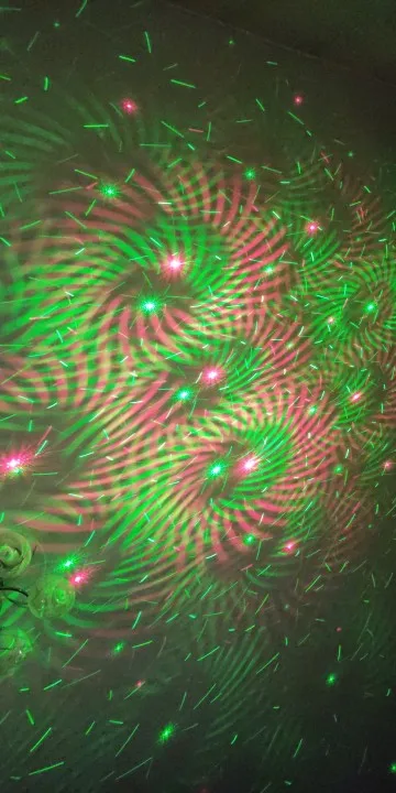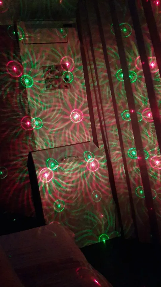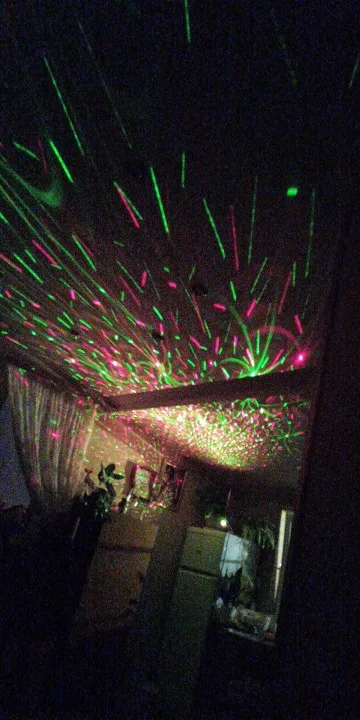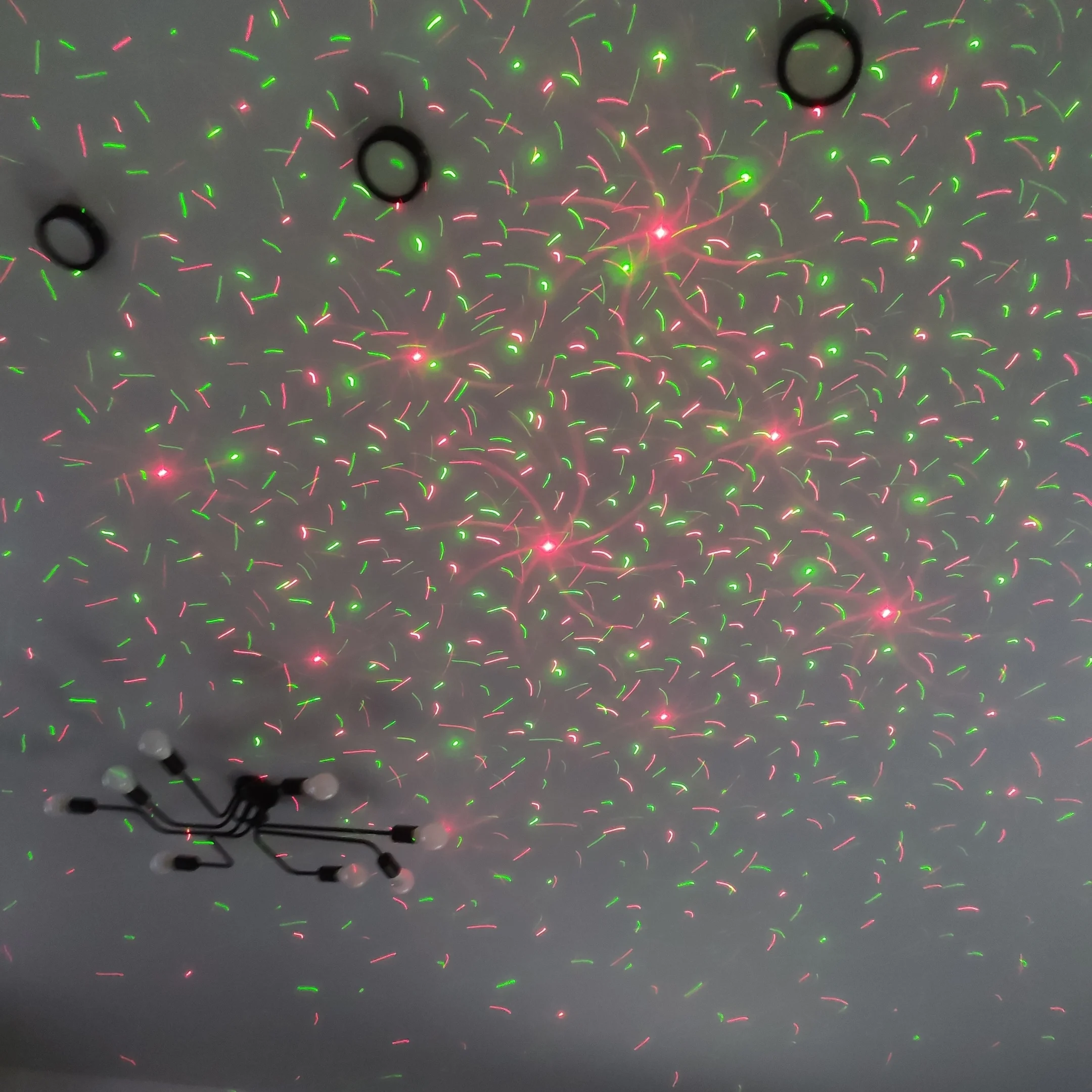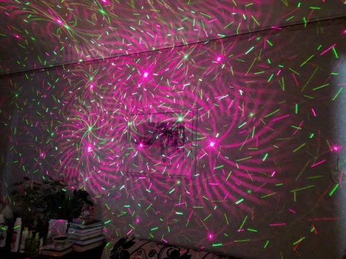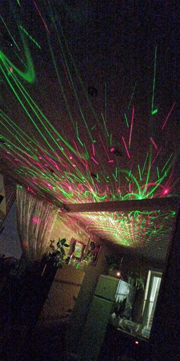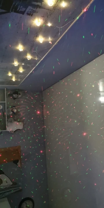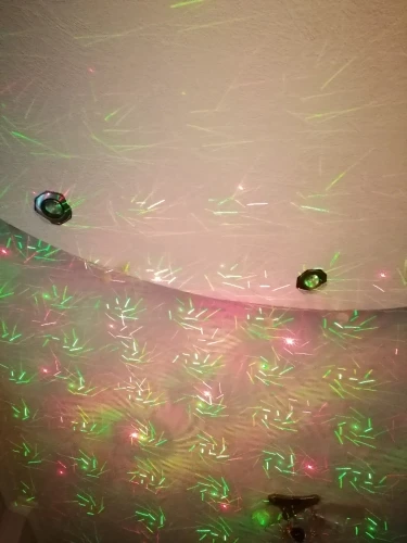Классный проектор, стоит своих денег, настроение задаёт, супер вещь! Корпус проектора пластиковый, в комплекте идёт специальный подвес, который можно поставить или подвесить, как вам нравится. На лицевой стороне проектора расположено отверстие, из которого светит лазерный луч розовыми и зелёными лучами. Как только включаешь в розетку, шоу начинается. Проектор светит очень ярко и динамично, рисунок проекций чёткий, охватывает 30кВ.м точно, и для высоких потолков идеально. Особенно ярко его видно конечно в полной темноте. Проекция имеет красивые и чёткие рисунки, в виде красивых бегающих точек, зигзагов и прочих. Доставка составила всего 10 дней, проектор был отлично упакован, в плотный почтовый пакет, пупырку и коробку магазина, товар рекомендую