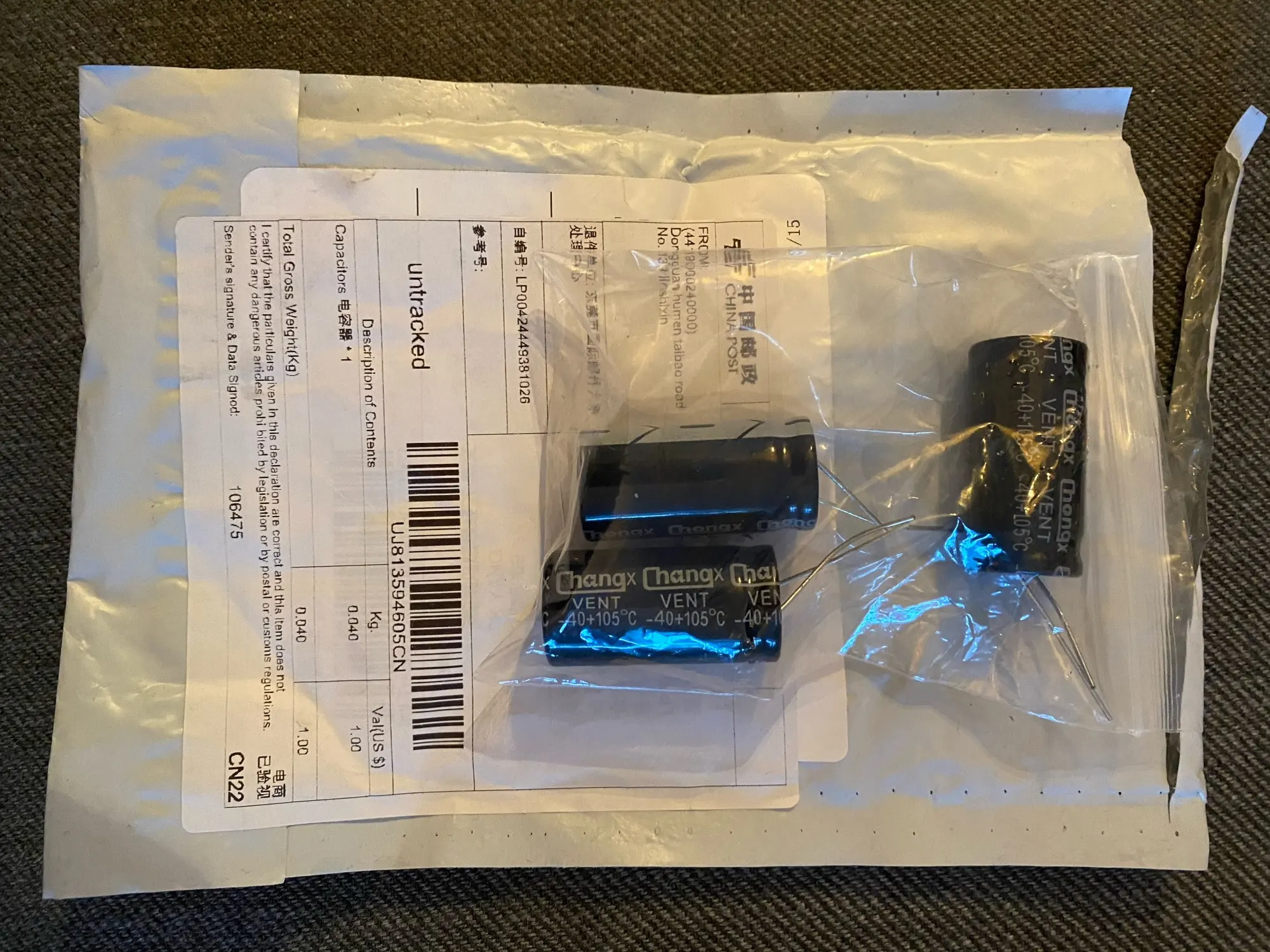 Посылка была возвращена в китайском контроле выхода, я не понимаю, почему это происходит, если посылка имеет только конденсаторы. Теперь цена доставки выше, я не знаю, должен ли он что-то видеть. Деньги были возвращены.