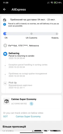 Страна: UA Доставка: Cainiao Super Economy 16.03.2021
