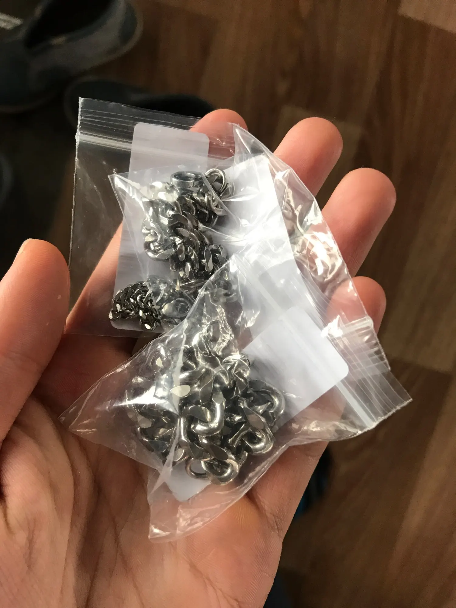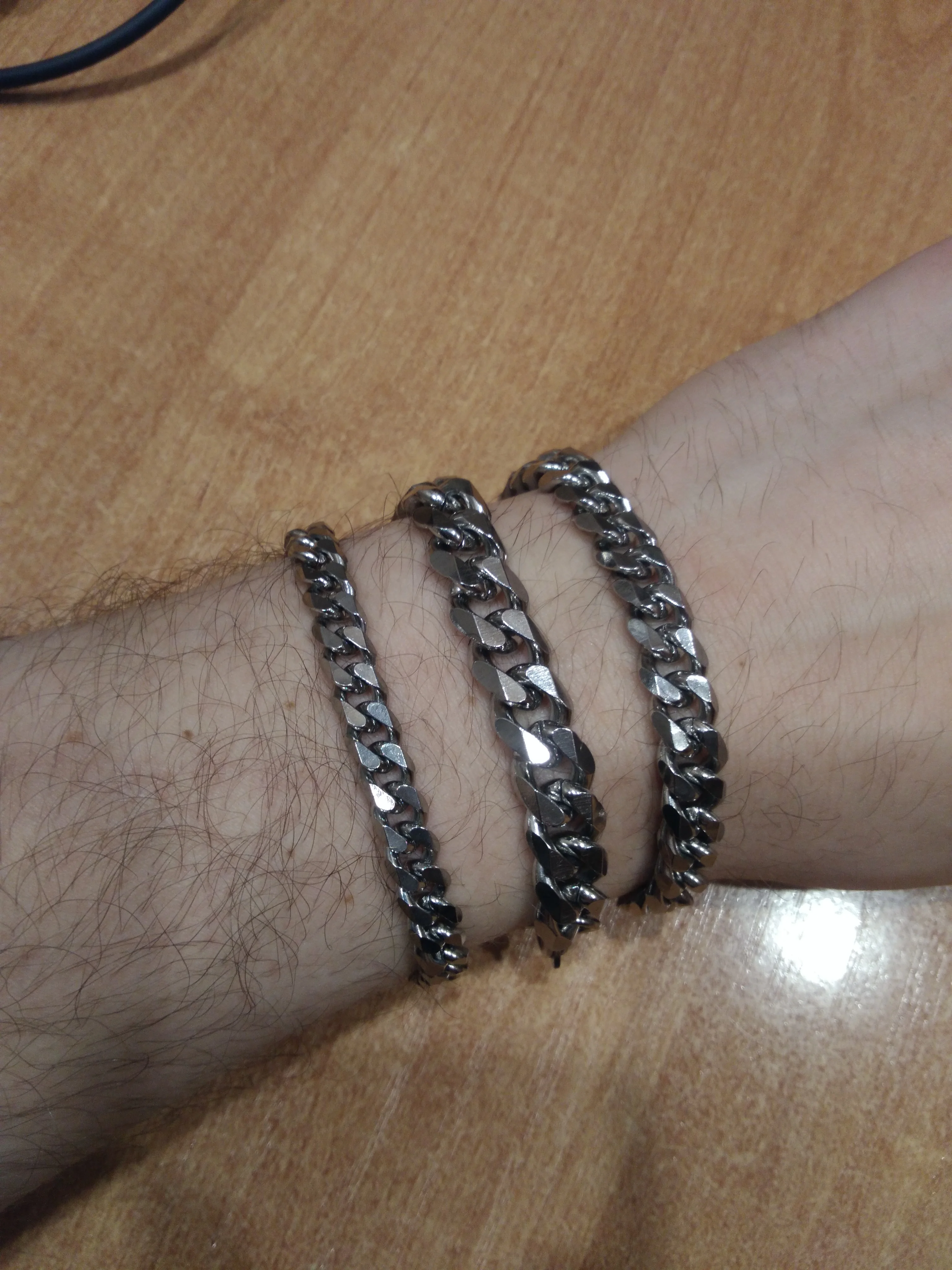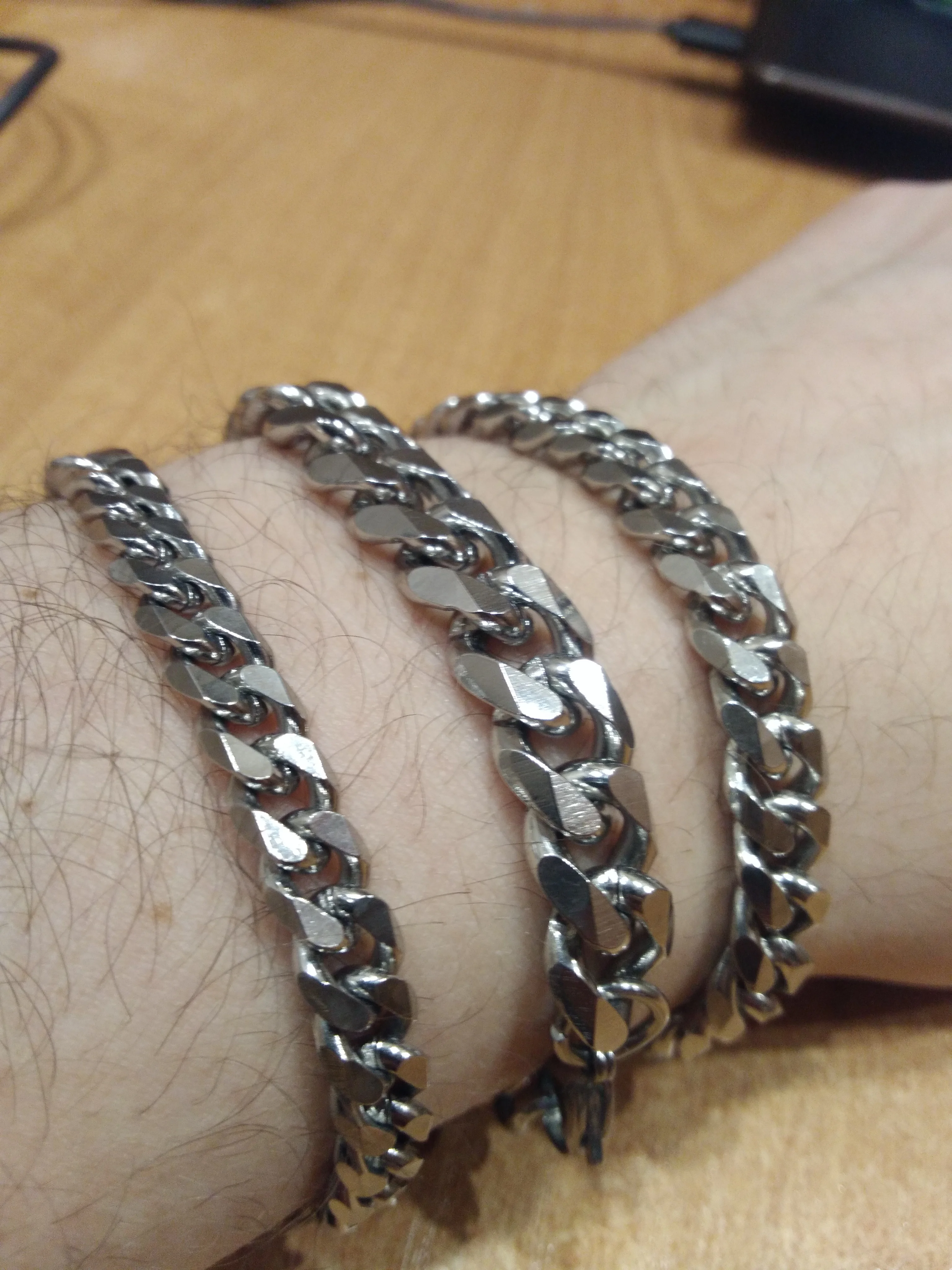 Всё ништяк. Пакет дошёл до Воронежа за 12 дней. Выглядят цепи превосходно, вес ощущается на руке. Предполагаю, что металл нормальный и не покрыт краской, которая слезет, превратив сталь в метал цвета детской неожиданности. На фото слева направо представлены цепи толщиной 7, 11 и 9 мм. Длина 18 см соответствует заявленной - цепи идеально обернулись вокруг руки. Продавца настоятельно рекомендую.