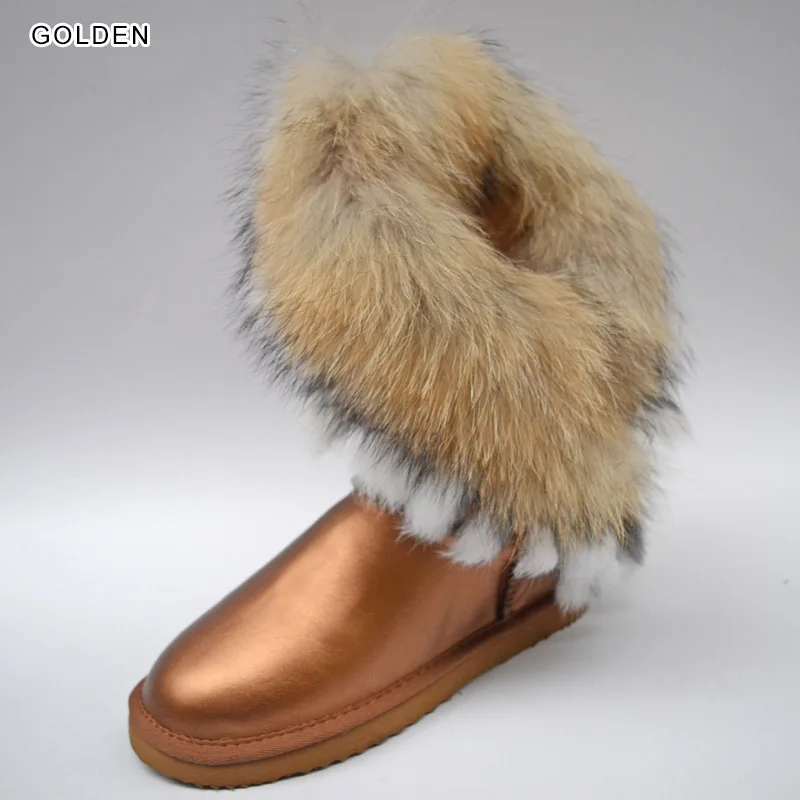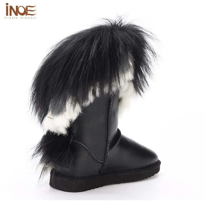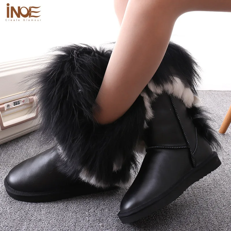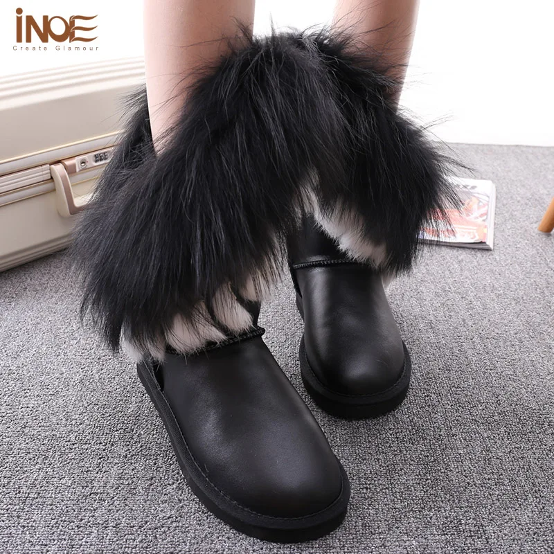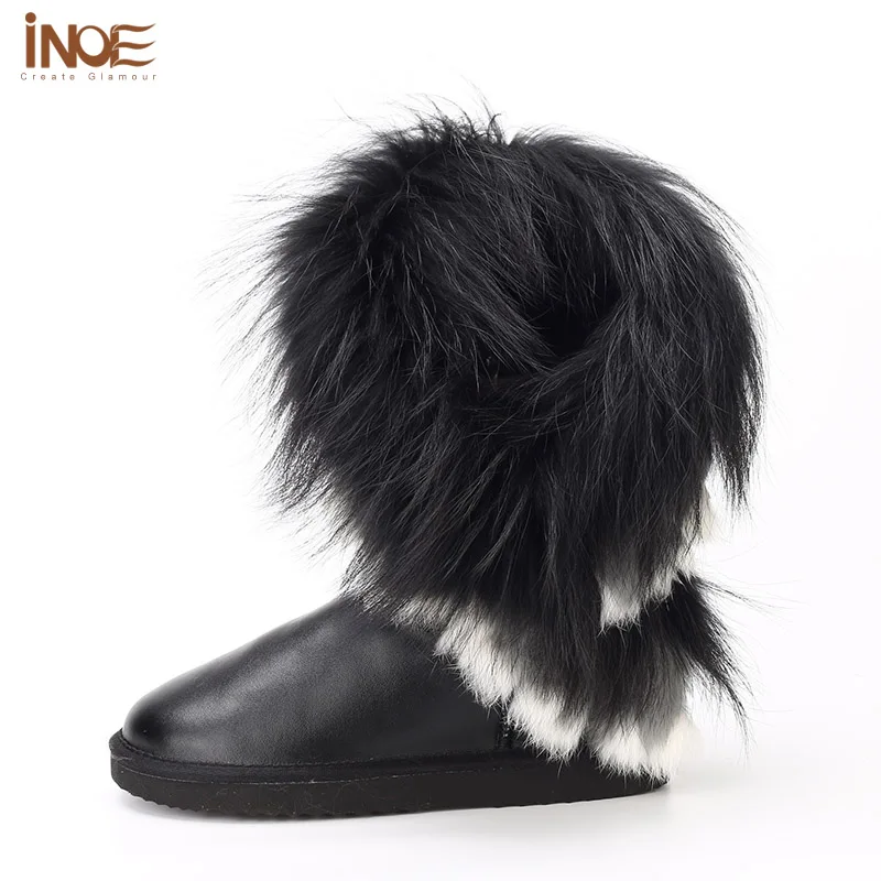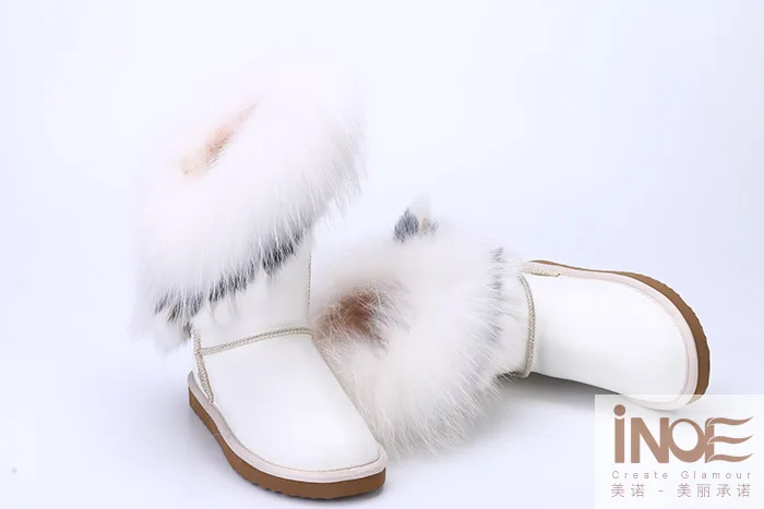 Внешний материал: коровья кожаВнешний мех: натуральный мех лисы и натуральный мех кроликаВнутренний материал: синтетический овечий мехВысота голенища: около 30 см (от подошвы до верха)Бренд: INOEВысокое качество!