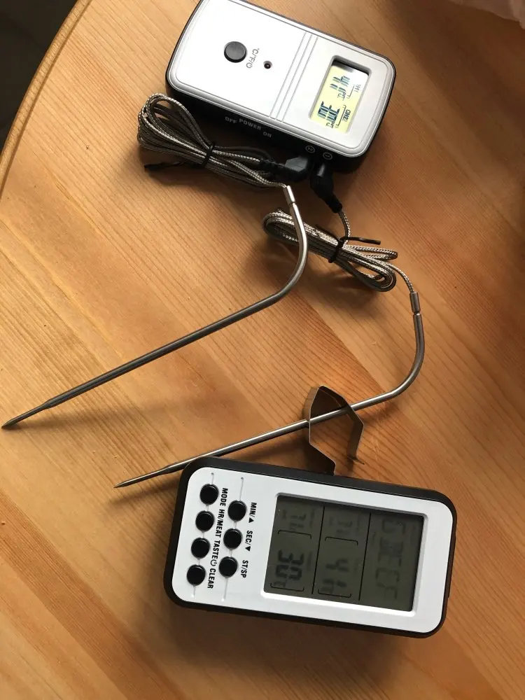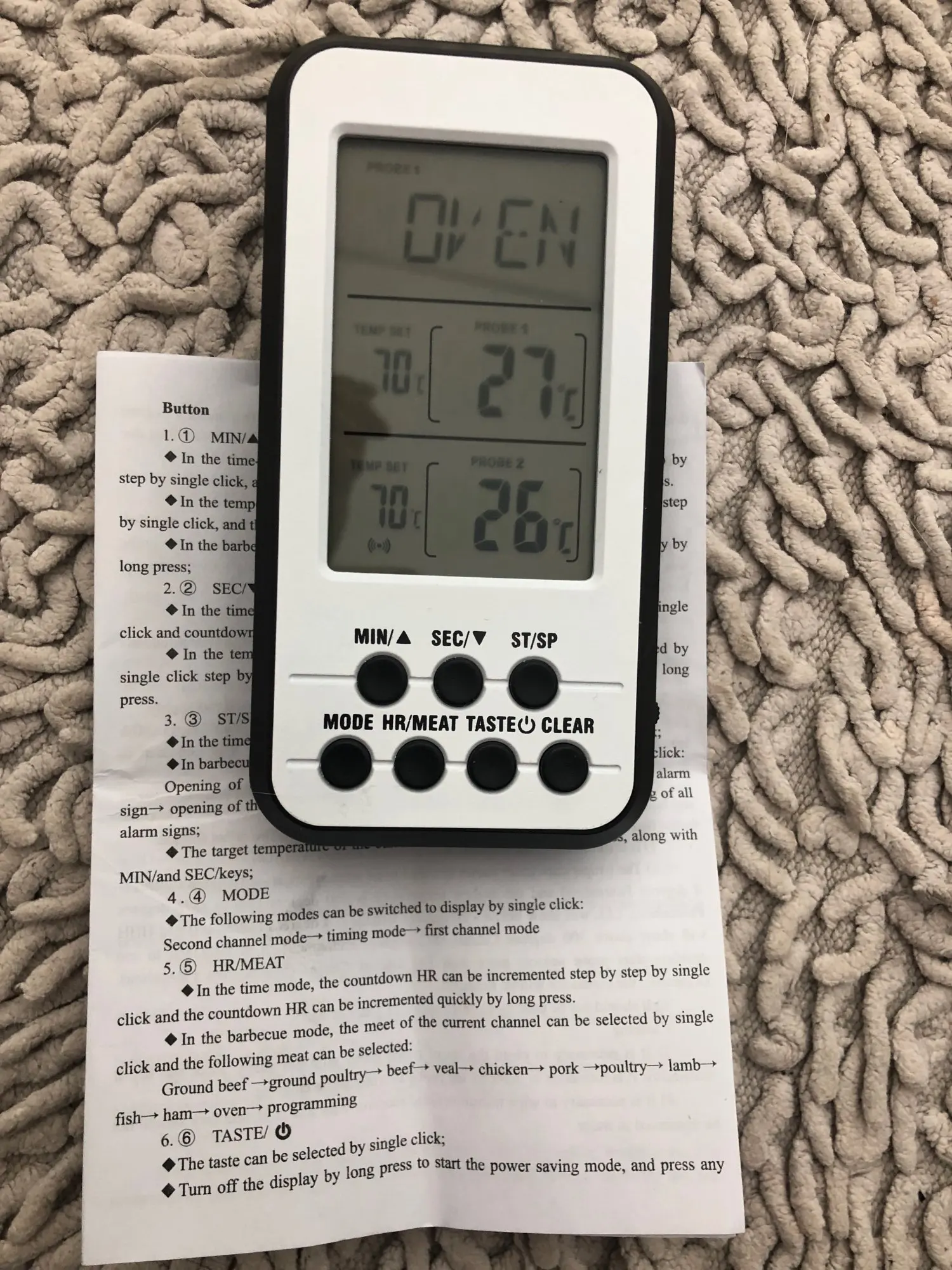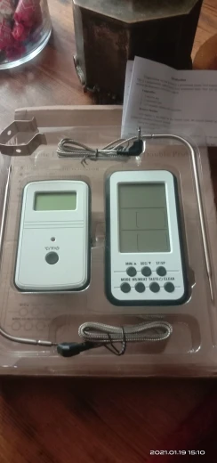 Внешний вид термометра немного пугает, т.к. пластик выглядит хлипким, но испытание прошёл на „ура". Сначала проверила оба щупа на закипающей воде, оба четко показали 100 градусов в момент закипания. Решила испытать при приготовлении колбасы. Сначала при покупке ругала себя за расточительность, что купила прибор с двумя щупами, с расчëтом "авось когда нибудь пригодится", но второй щуп понадобился в первое же использование. По технологии надо было выставить температуру духовки в 80 гр. и держать колбасу до достижения внутренней температуры в 69 гр. И вот я заметила, что температура колбасы перестала подниматься выше 60 градусов, хотя духовка стоит на отметке 80. Тогда я сунула второй щуп в духовку и поняла что духовка врëт на 14 градусов. Так, благодаря двум щупам я смогла доготовить колбасу в соответствии с технологией. П.с.: термометр доставили через неделю курьером прямо домой, несмотря на то, что я живу за городом.