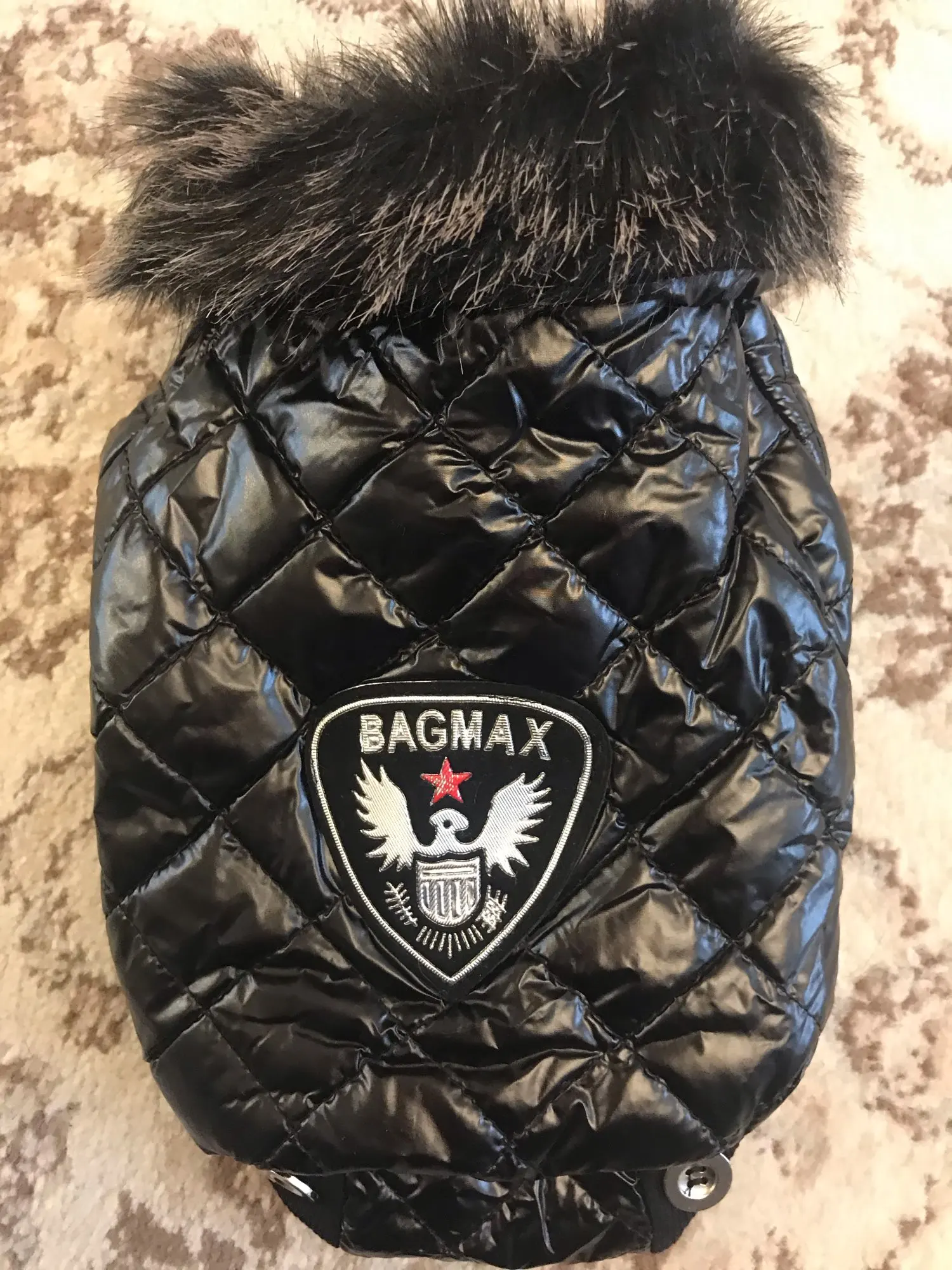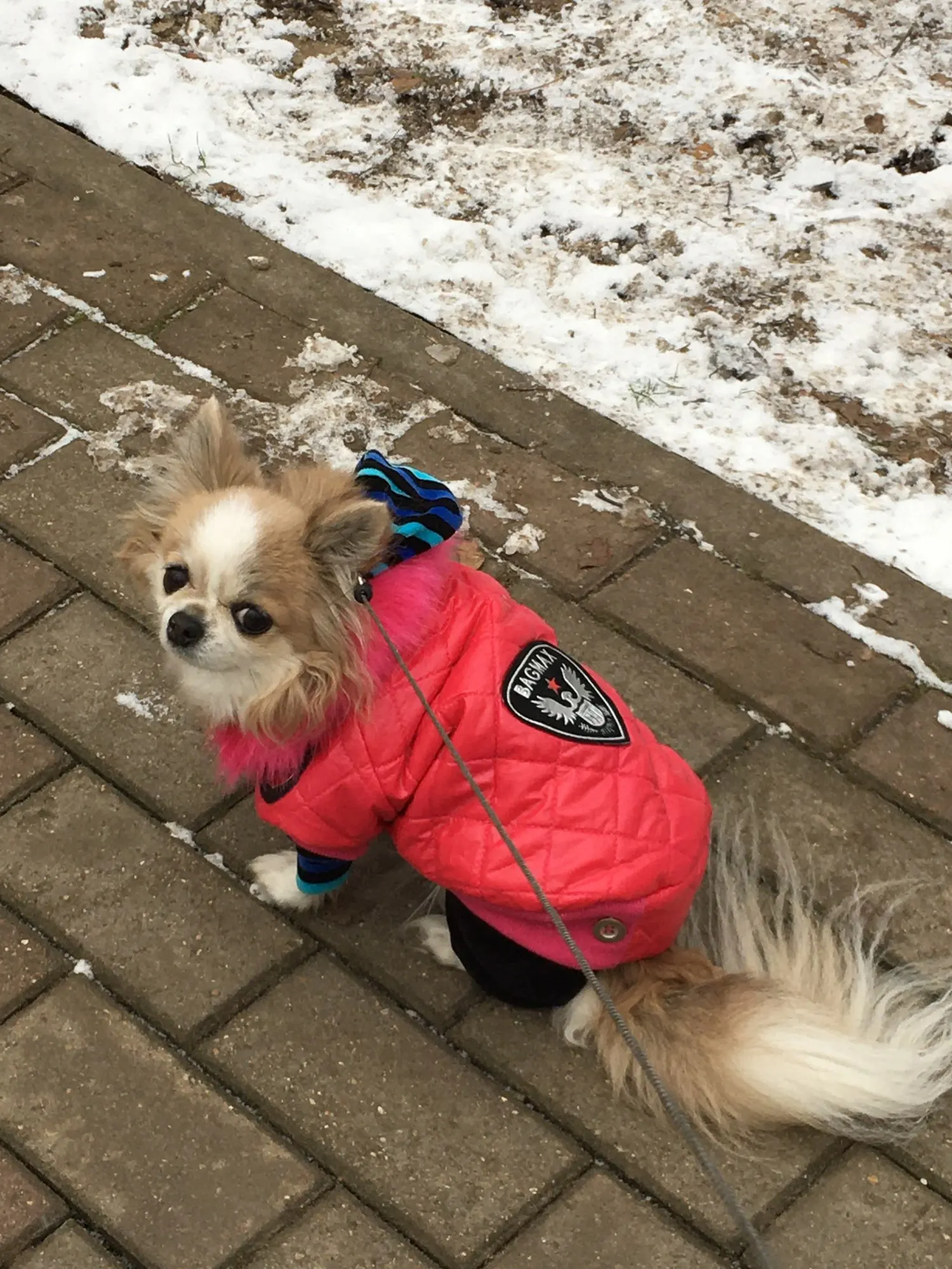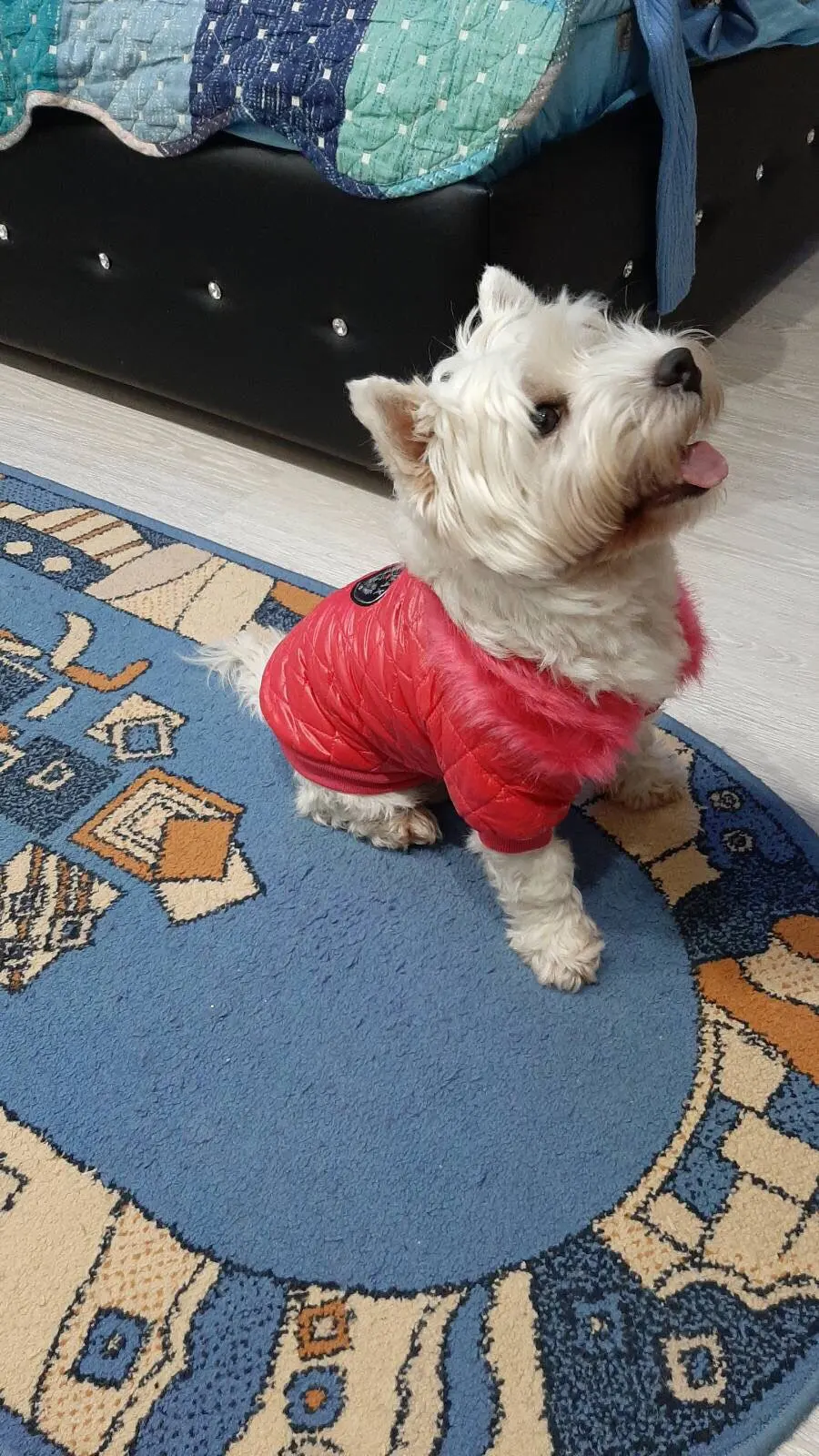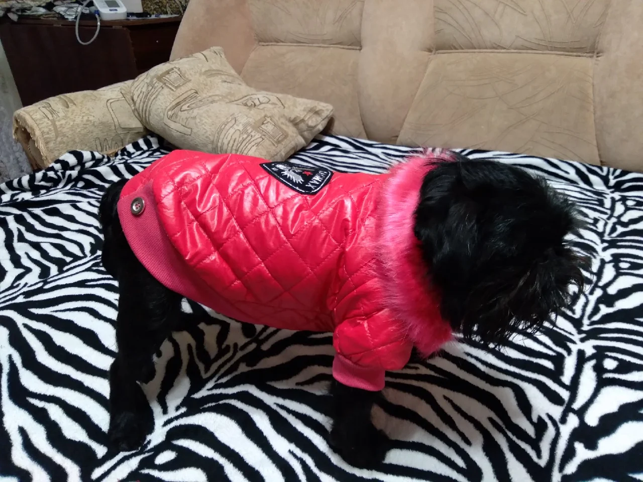Очень симпатичная курточка. Качественно сшита. Нитки нигде не торчат, запаха нет. На шпица 3.5 кг чуть длинновата, зато по объему груди в самый раз. Доставка до Москвы 3 недели. Спасибо.