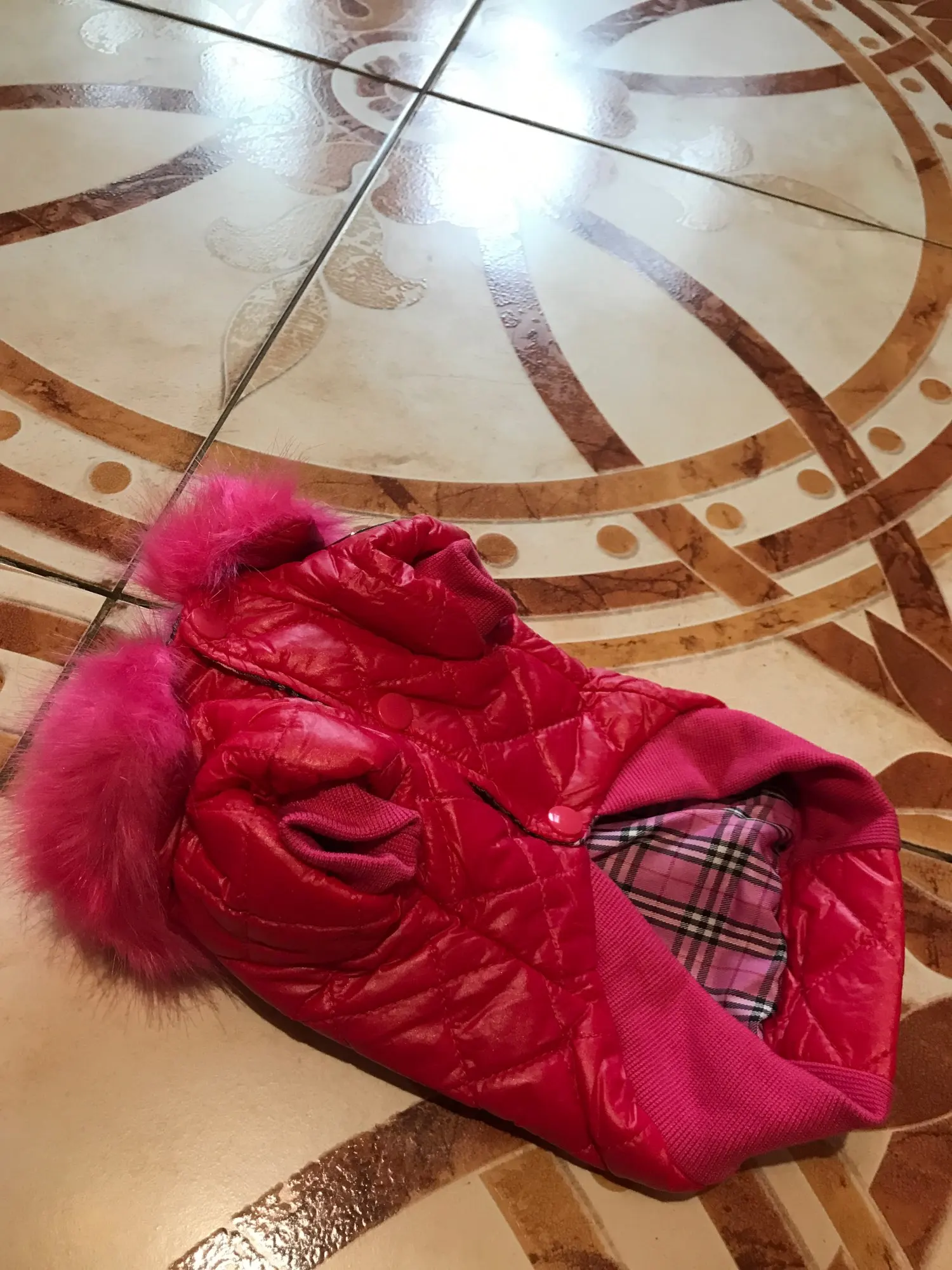 Ну как бы я не понимаю почему здесь никто не пишет о том, что куртка как бы чем то намазана была для блеска, начала мыть лапы собаке и о ужас розовый налёт от куртки появился в воде, конечно я постирала ее сразу и норм и теперь она не блестящая, ну хоть бы кто написал об этом, а так вещица красивая, но цена ей 200р