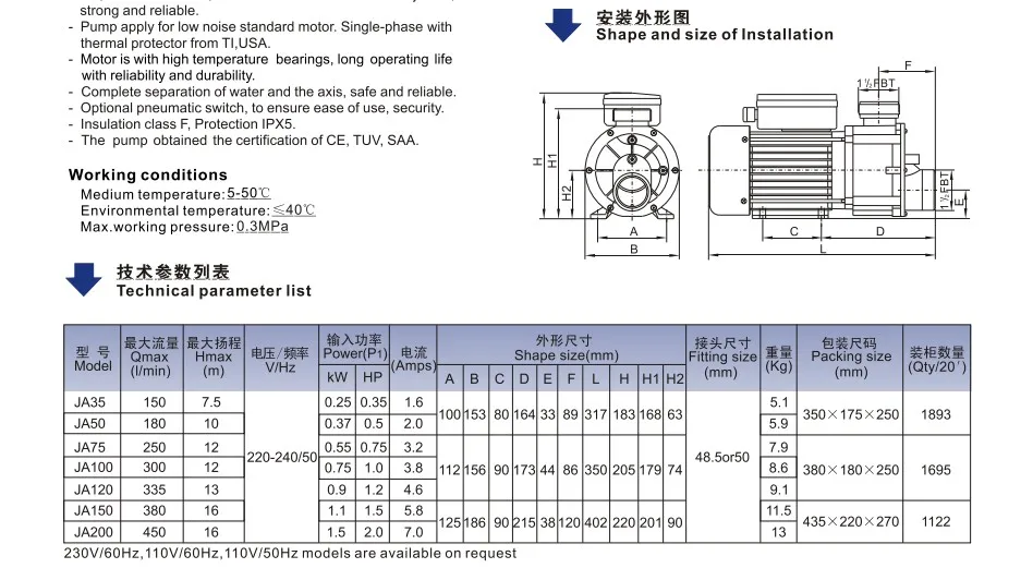 Циркуляционный насос для спа 370 Вт 0.5HP JA50 50 Гц 220-240 В 2900об/мин для Австралии 60 Гц 220-240 В 3450об/мин для гидромассажной ванны из США и Канады