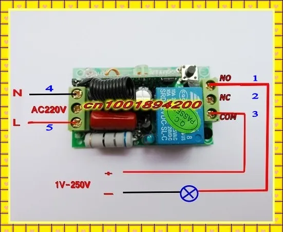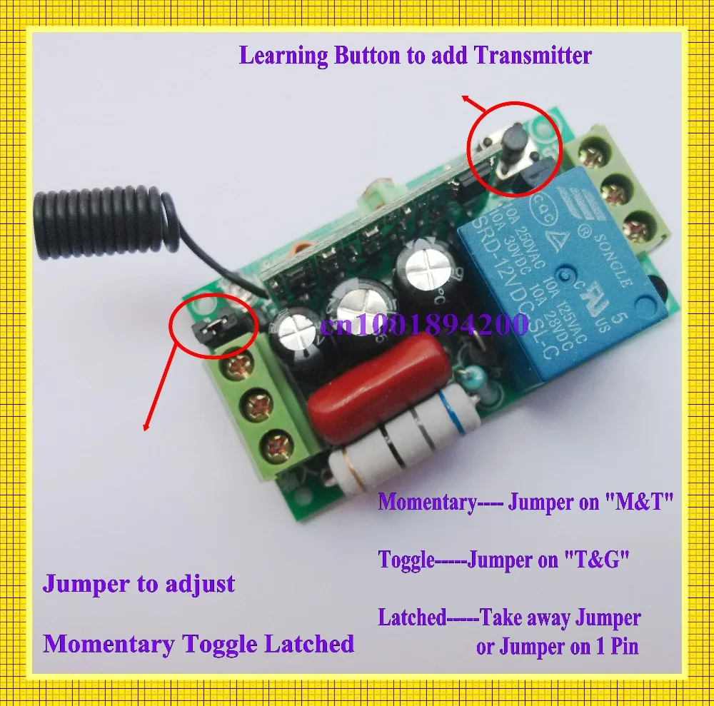 2. Максимальный ток: 10A (лучше, чем 7A)3. Канал: 1CH4. Рабочая частота: 315 МГц/433MZHЧувствительность приемника: -105 дБРабочая температура: -20'C - + 60'CВыход: Мгновенный. Переключения. Защелкивается регулируемыйТип кода: Обучающий код добавьте контроллер с помощью кнопки обучения на приемнике Выход Состояние:Это корректируется с перемычкой на приемника,