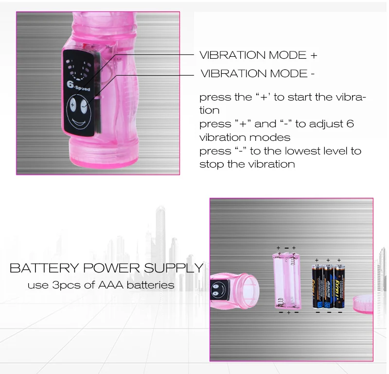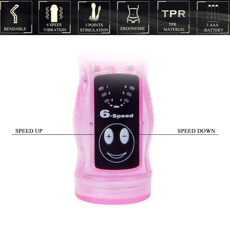Материал: TPR/ABS Размер: 225*35 мм Цвет: розовый Питание: 3 * AAA батареи (не входят в комплект) Приятный для кожи и без запаха 6 режимов вибрации Двойные двигатели G-spot/клитор/анальная стимуляция Свободный изгиб Мягкий и эластичный