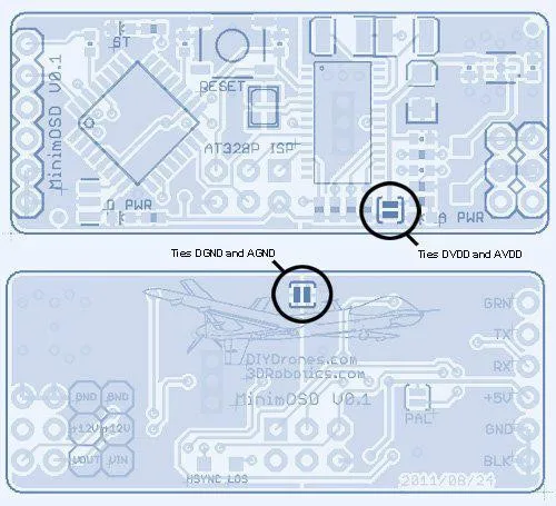 Сырье 12 В от Lipo батареи:Питается непосредственно камерой FPV и видеопередатчиком.Он также питает аналоговая линия max7456 (AVDD и AGND) регулятором напряжения 5 В (избегая шумов от сервоприкрепляемых к APM).5 В от APM telem порта:Питает цифровую линию ATmega 328P и Max7456's (DVDD и DGND);Примечание:При необходимости вы можете использовать две паяльные скачки для «связывания» цифровых и аналоговых линий.