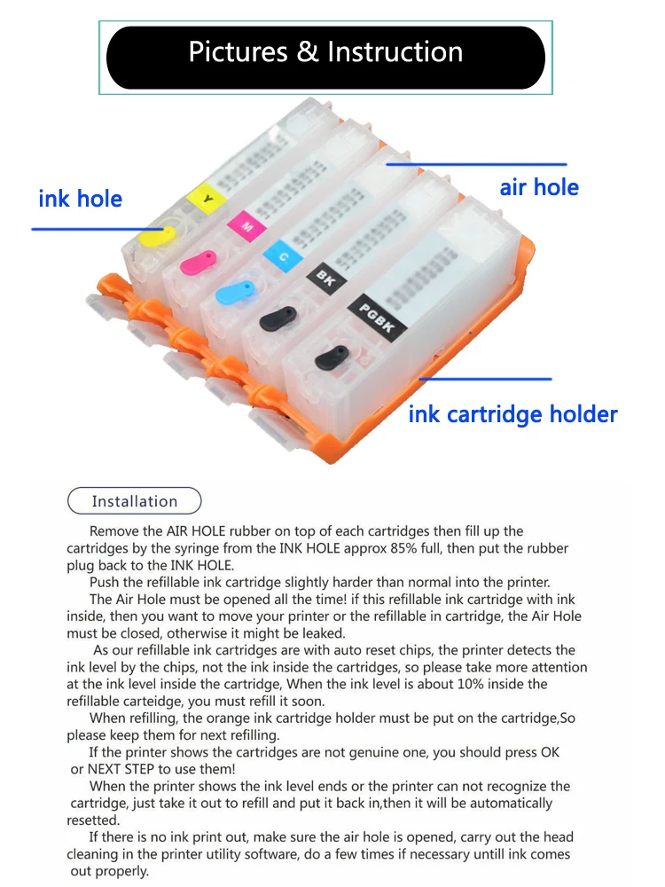 Особенности: 1. Картридж прямого пополнения может заполнить чернила напрямую, принять ТворческийДизайн, заполнение чернил легко: Заполните чернила полностью в картридж с помощью шприца, без использования вакуумаМетод пополнения, не нужен специальный инструмент для наполнения и специальный техник. ЭтоПатрон изобретения веха.2. Аналогичная структура с оригинальным картриджем, с использованием антипригарной губки, может быть заполнена пигментом или съедобными чернилами. Предотвращает поломку головки принтера из-за старения картриджа.3. Инновация на основе картриджа первого поколения, убедитесь, что нет утечки чернил, точки печати, блок при печати