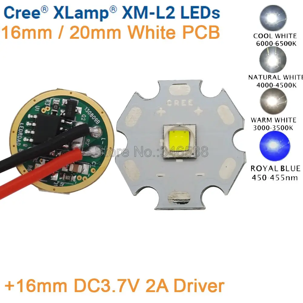 Светодиодный излучатель Cree XML2, холодный белый, теплый белый, 10 Вт, высокая мощность, 16 мм, белый, PCB + 16 мм, DC3.7V, 2A, 5 режимов