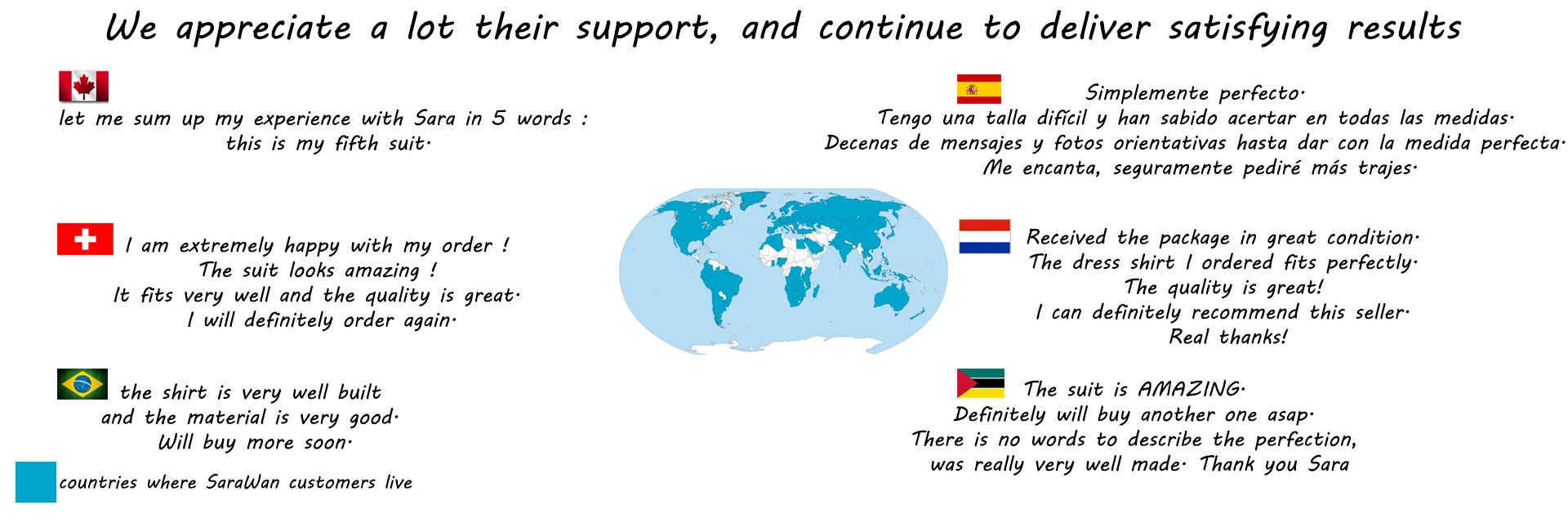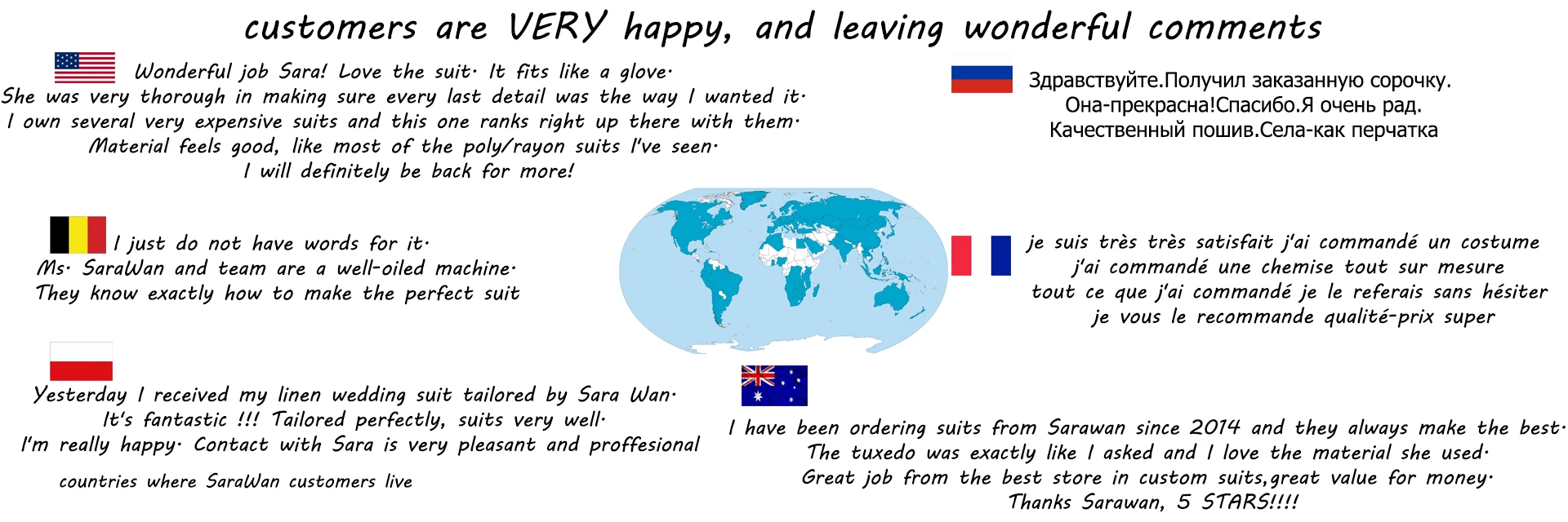 Что клиенты говорят о нас?-"Я не могу выразить, насколько я рад этому костюму. ЭтоИдеально подходит. ЭтоНа ощупь отличноИКачество ткани действительно хорошее. Все 5 звезд обратной связи, я здесь на Aliexpress,Сара и этот костюм заслуживает их больше всего. ЭтоЛучшая покупкаЯ сделал здесь, и я обязательно закажу больше. Обслуживание и доставка также былиОтлично подходит. Если вы продолжите движение по этой трассе и не получите неряшливого эффекта, у вас будет много довольных клиентов. Дорогой Сара, большое спасибо. + + +"