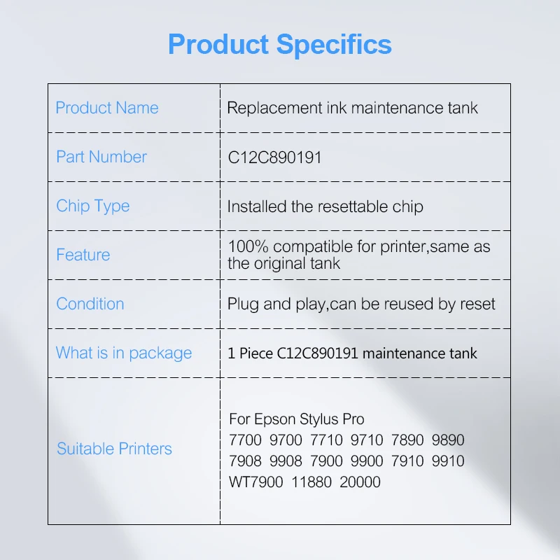 Убедитесь, что принтер серии Stylus Pro большого формата будет продолжать производить высококачественные принты, которые вы ожидаете с этой заменой C12C890191 бак обслуживания от Epson.