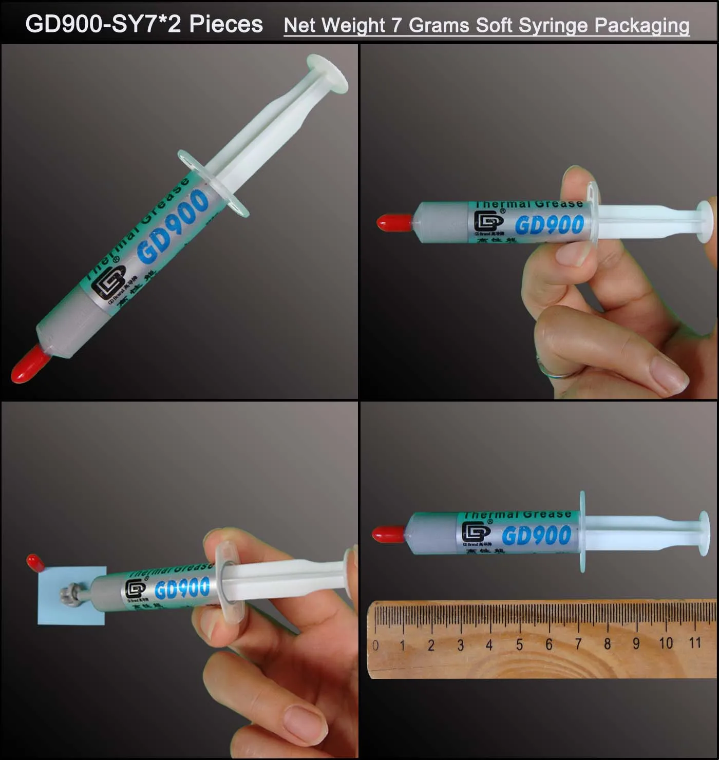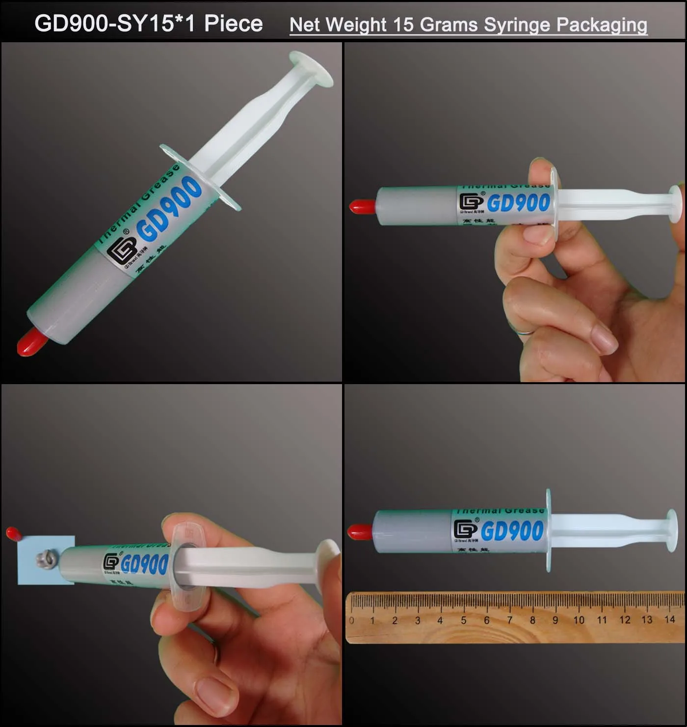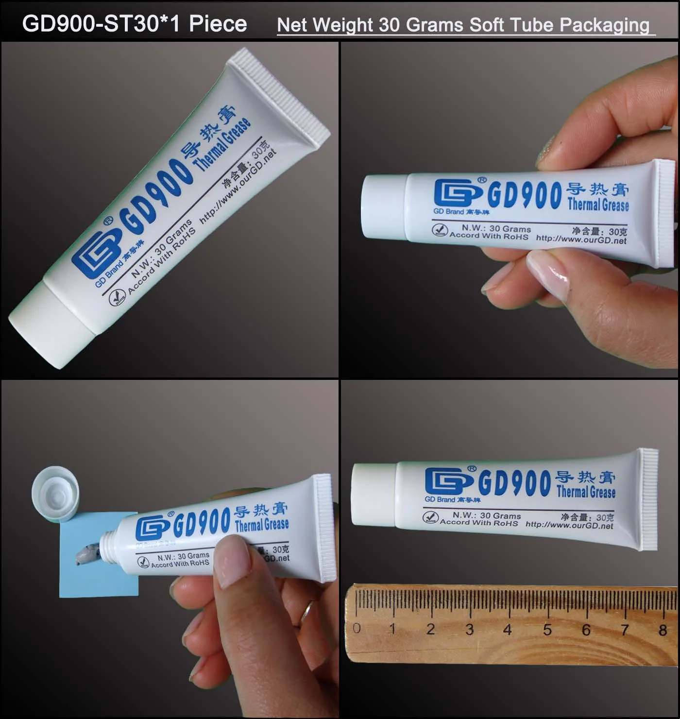 Изделие соответствует описанию. Купите пару 30. С плунжером или «дозатором» весит 44гр. Оба весили около 90 гр. Я не мог измерить проводимость (способность управлять теплом). Не указывайте «Реальное» качество продукта в качестве теплоотводящей пасты. Тем не менее, изделие с внешним описанием, как GD900 /30 соответствует опубликованным. Товар прибыл очень быстро в маленькой обычной картонной коробке. Если все соответствует указанному и работает соответственно, я бы без колебаний покупать снова. Благодарим руководство продавца за все.