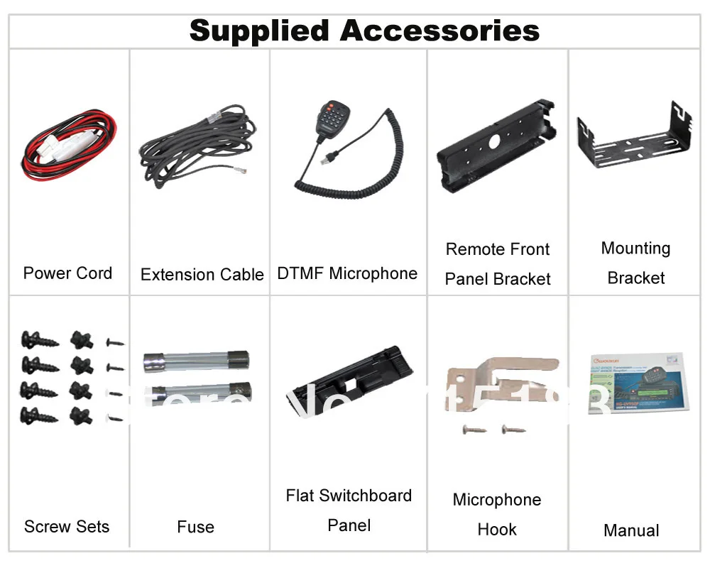 1 x KG-UV950P Мобильный приемопередатчик1 Микрофон1 x мобильный монтажный кронштейн1 шнур питания постоянного тока с предохранителем2 запасных предохранителя 15 А1 & chi; Зажим для микрофона1×Плоская распределительная панель1×Наборы винтов1×Кронштейн для передней панели дистанционного управленияРуководство по эксплуатации на английском языке-1 шт.1 гарантийный талон