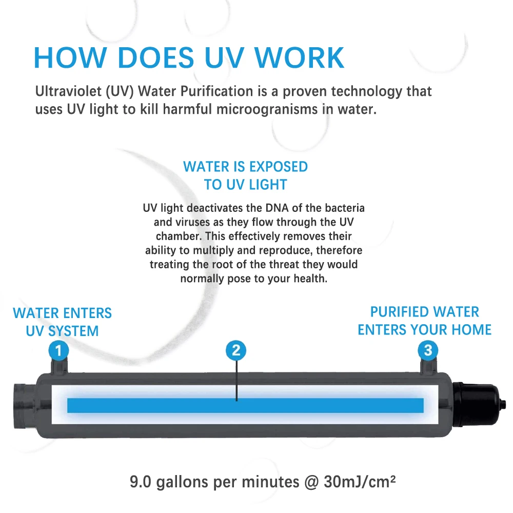 Система УФ-дезинфекции Coronwater является передовой системой дезинфекции ультрафиолетовой воды, которая обеспечивает дезинфицированную питьевую воду на долгие годы и была разработана с высококачественной конструкцией и инновационными функциями.Стерилизация воды с использованием ультрафиолетового светильник с длиной волны 254нм-это химический свободный способ уничтожения крови микроорганизмов, которые не могут воспроизвести или вызвать инфекцию. Конструкция камеры потока использует энергию от ультрафиолетовой лампы равномерно через поток воды. Установка системы является прямой и простой. Техническое обслуживание включает в себя Изменение лампы один раз в год и периодически чистку кварцевого рукава.
