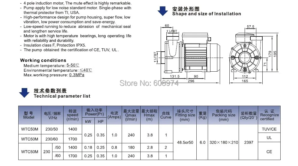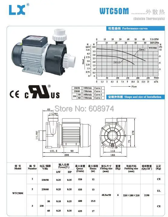 Особенности: LX Джакузи Ванна насос WTC50M является наиболее зрелым продуктом. Жидкостная часть изготовлена из высокоусиленного инженерного пластика; Применяемое механическое уплотнение обеспечивает водонепроницаемость при длительной непрерывной работе. Жидкость будет сливаться после выключения двигателя.
