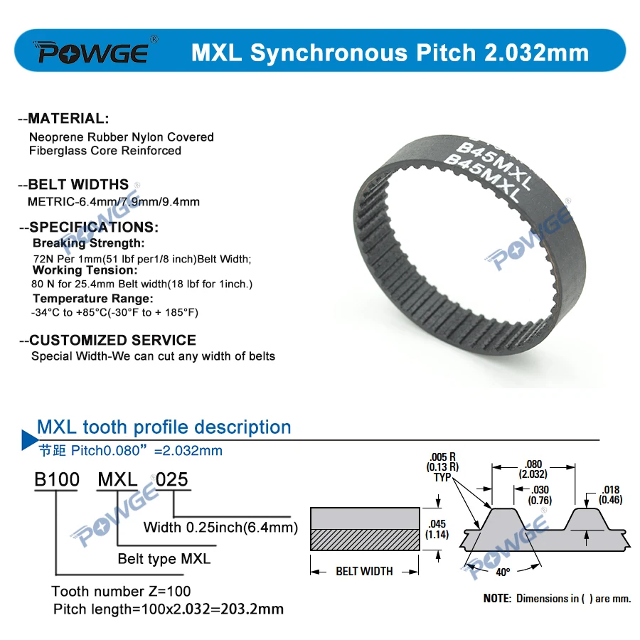 Если вам нужен другой синхронный ремень размера MXL, пожалуйста, свяжитесь с нами,Мы можем отрезать любую ширину ремня ГРМ MXL