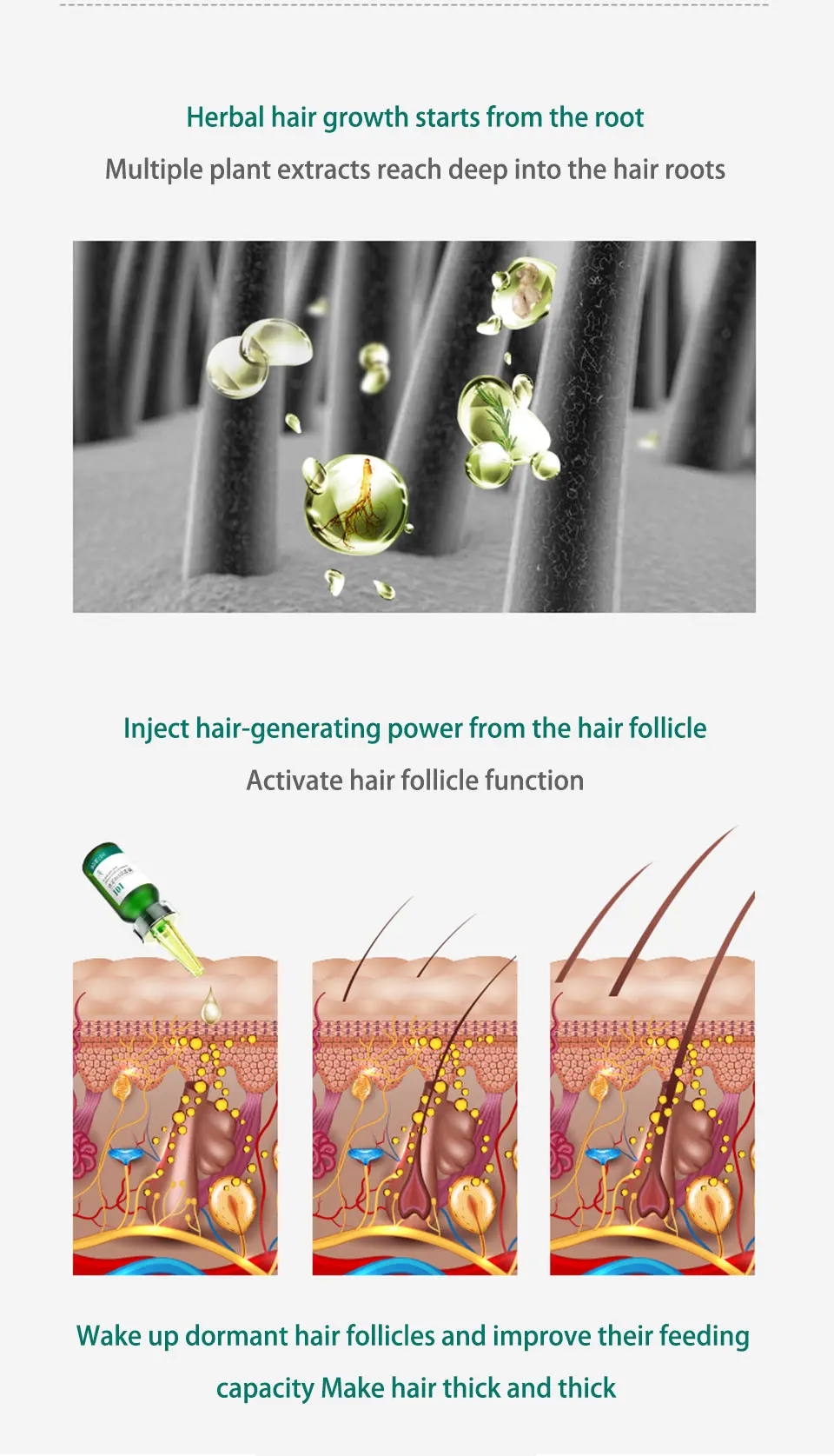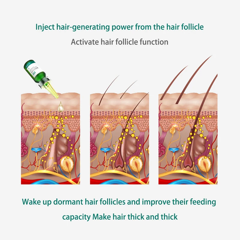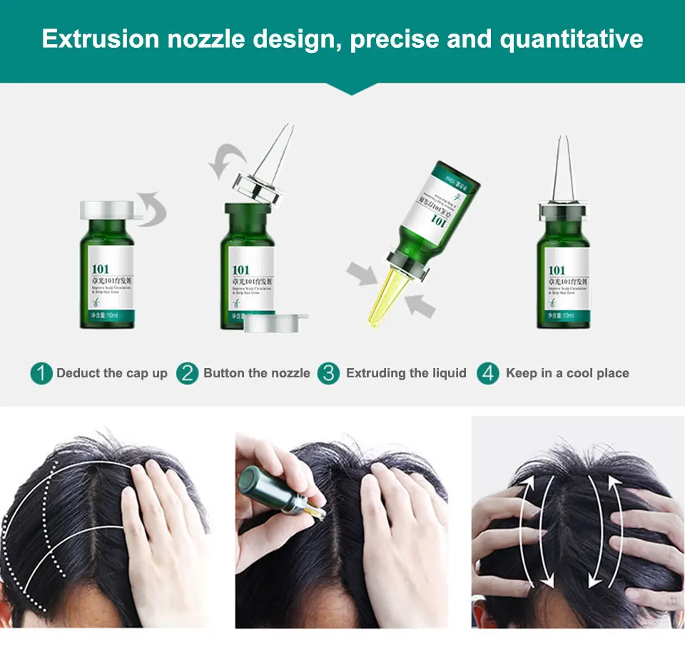 1. Используйте руки или расчесывайте, чтобы раздвинуть волосы, чтобы разоблачить кожу головы 2. Поместите насадку близко к коже головы и нанесите на кожу головы, чтобы впитать, возьмите 5-10 мл два раза в день (см. Конкретный размер области использования), не нужно мыть 3. Вы можете массировать кожу головы в течение 2-5 минут, чтобы помочь коже головы поглощать больше эссенции
