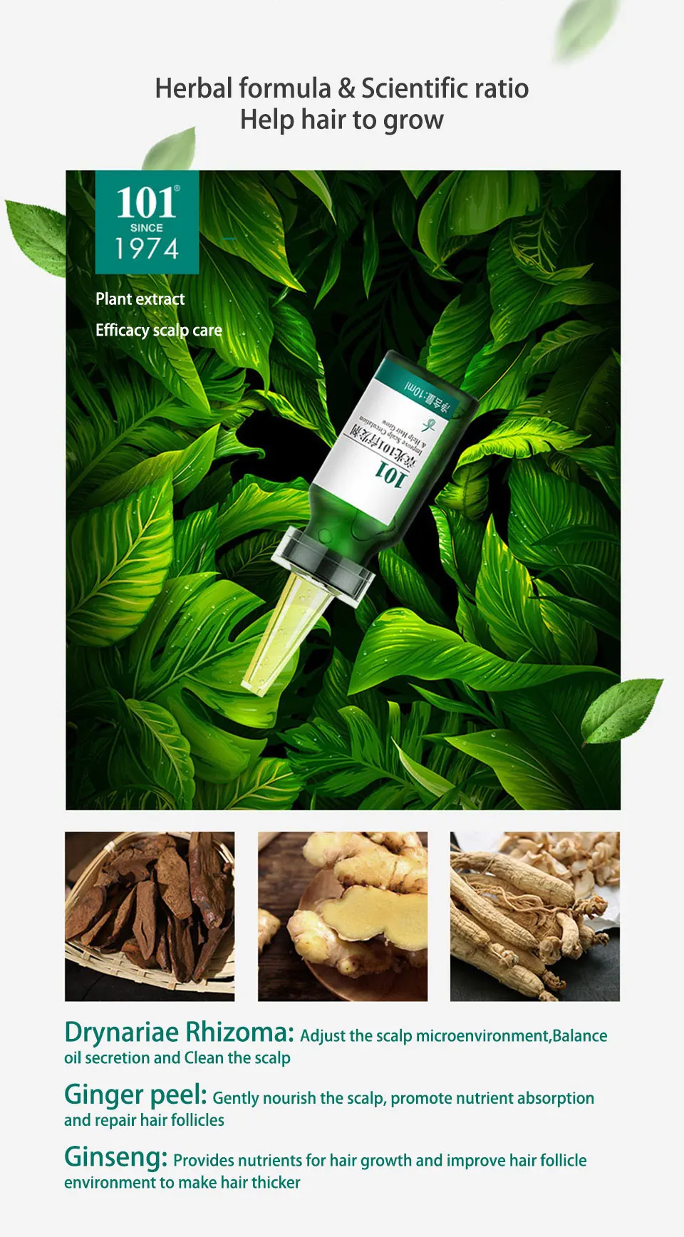 Название продукта: 101 Формула Происхождение: Китай Емкость: 10 мл * 16 Ингрендиенты: китайские травы, без побочных эффектов Эффект: улучшает циркулярион кожи головы и помогает росту волос, предотвращает выпадение волос Использование: нанесите на кожу головы, чтобы впитать, принимайте 5-10 мл два раза в день, не нужно мыть Для людей: у кого-то с тонкими волосами или алопецией, унисекс, нет возрастных ограничений Анонсы: Используйте с осторожностью у аллергиков, если он попадет в глаза, сразу краску водой
