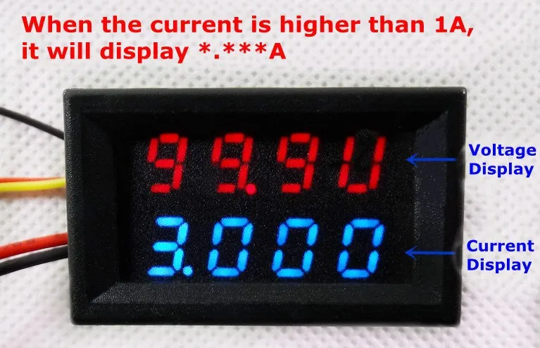 Ниже Цифровой ток дисплея трубки; Есть четыре фиксированных точности дисплея; Диапазон измерения 0-999.9mA-3.000A. Когда измерительный ток ниже 1 А, он отображается ***.* МА, разрешение 0.1ма; Когда измерительный ток выше 1A, он отображается *.*** A, разрешение 1 мА;