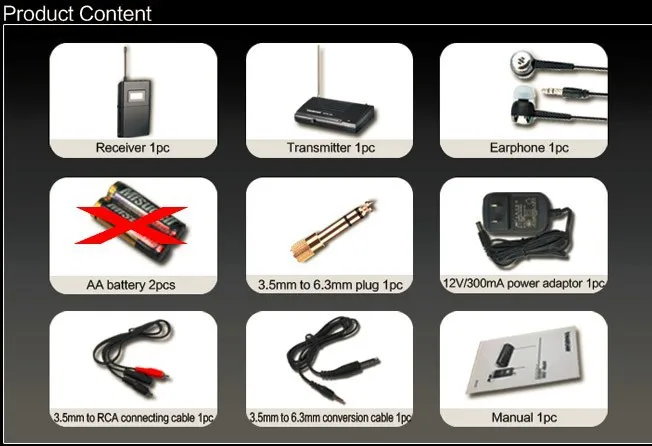 Передатчик:? Частотный диапазон: 780-789 МГц? Источник питания: 12 В постоянного тока/мА? Мощность передачи:? 10 дБм? Рабочий ток: 80 мА ± 10 мА? Рабочий диапазон: 50 мПриемник:? Источник питания: 3 В постоянного тока (2 батарейки AA)? Рабочий ток: 50 мА ± 20 мА? Соотношение сигнал/шум: >50 дБ? Чувствительность: S/N 12 дБ 3 УФ? Частотный диапазон: 30 Гц-18 кГц? Частотный диапазон: 780-789 МГц? Стерео разделение: >50 дБ