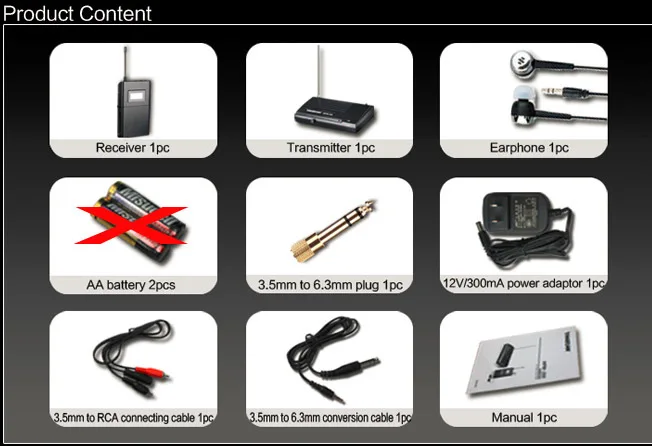 Передатчик:• Диапазон частот: 780-789 МГц• Источник питания: 12 В/300 мА постоянного тока• Мощность передачи: ≤ 10 дБм• Рабочий ток: 80 мА ± 10 мА• Рабочий диапазон: 50 мПриемник:• Источник питания: 3 В постоянного тока (2 батарейки типа АА)• Рабочий ток: 50 мА ± 20 мА• Отношение S/N: >50 дБ• Чувствительность: S/N 12 дБ 3 УФ• Частотная характеристика: 30 Гц-18 кГц• Диапазон частот: 780-789 МГц• Стерео разделение: >50 дБ
