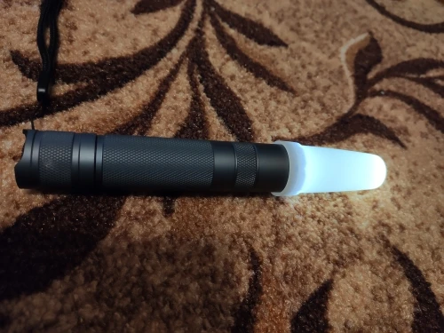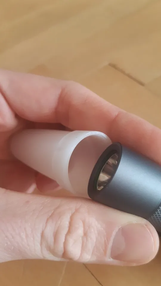 отличный колпачок. хотелось бы что то типа ограничителя внутри колпачка, который одевается на сам фонарик. а в данном случае одевается плотно, только его приходится выравнивать относительно фонарика. не критично, но хотелось бы чтобы стоял прямо. светит конечно очень ярко с колпачком, класс.