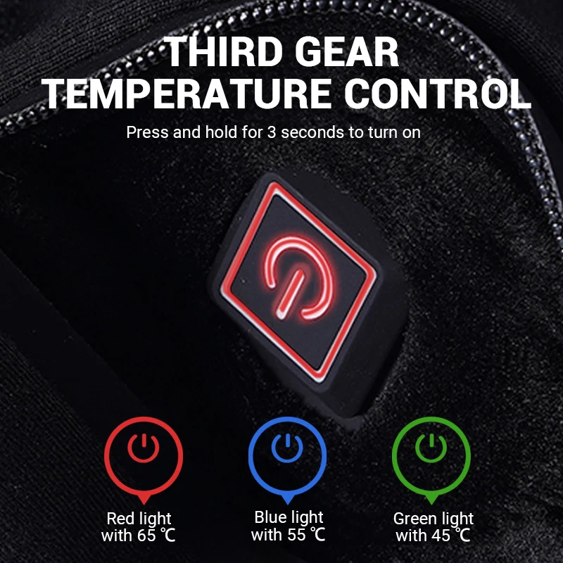 Как использовать:Зарядка-полностью зарядите внешний аккумулятор, перед использованием.Подключаемый Тип-подключает блок питания к разъему, расположенному в кармане.Нажмите и удерживайте кнопку ВКЛ/ВЫКЛ в течение трех секунд. Начальная температура 55-65 градусов (красный светодиод), промежуточная температура 45-55 градусов (синий светодиод) и самая низкая 35-45 градусов (зеленый светодиод).