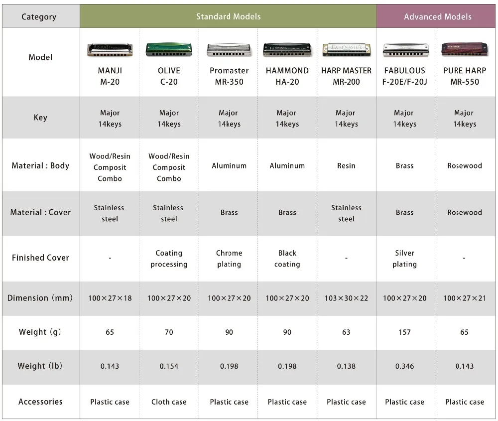 Разработанный в сотрудничестве с органами Хаммонда, Promaster Hammond сочетает выдающиеся лазерные настроенные трости Suzuki с гладкой и функциональной расческой и дизайном крышки от Hammond. Promaster Hammond имеет прекрасный насыщенный тон, когда играет в режиме прямой арфы, а также удивительно резонирует в нижней октаве, чтобы дать этим громоздким кросс-Харп-тонам.