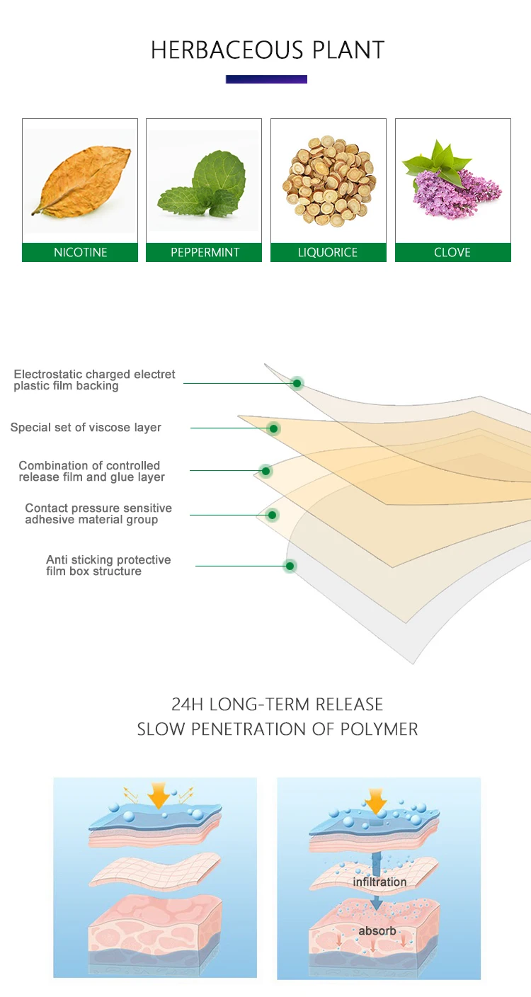 Анти-дымовая пластырь применяет трансдермальную технологию задержки выпуска. Результаты исследований международных лекарственных средств и лекарств показывают, что это самый эффективный метод отказаться от курения с помощью анти-дыма патч. Для всех людей, которые решают бросить курить, это может помочь вам избавиться от табачной зависимости, отпустить реакцию на синдром воздержания, чтобы достичь цели бросить курить. Он поглощается кожей, позволяет избежать повреждения человеческого организма, вызванного огромным ядовитым и вредным веществом от зажженной сигареты. В то же время это позволяет избежать курения второй рукой. Основной ингредиент оказывает влияние на детоксикацию, успокаивает нервы, охлаждает и освежает.