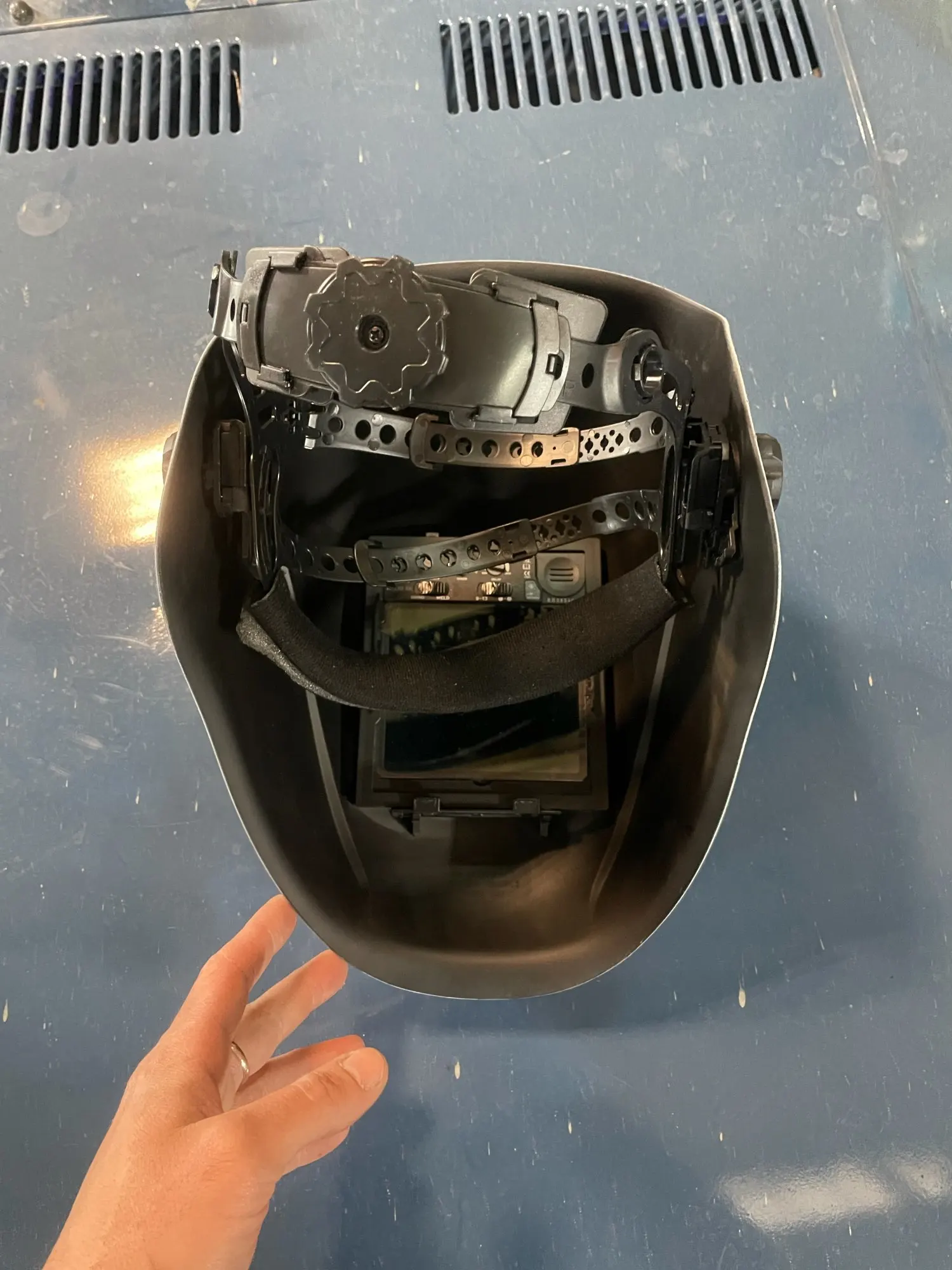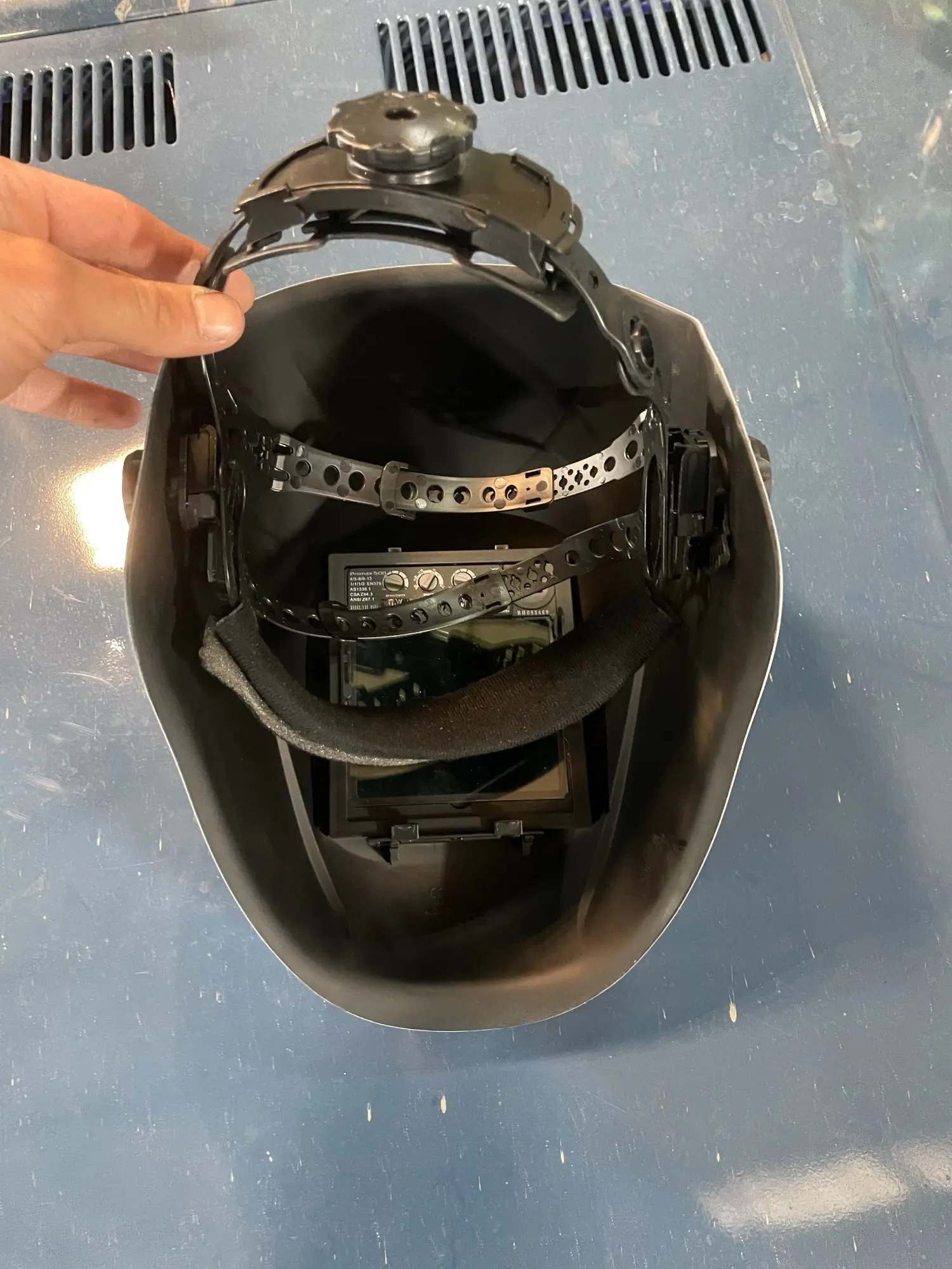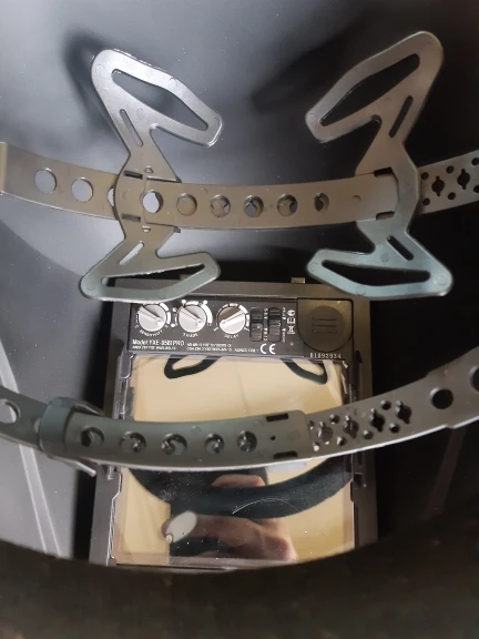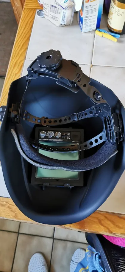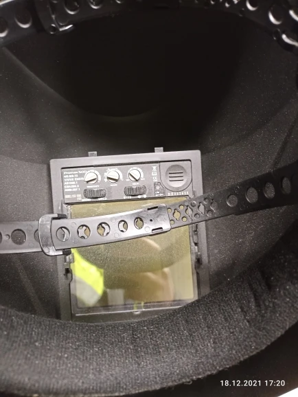 Маску хорошо упаковали в пенопластовый кейс,и убрали в картонную коробку.Хорошая маска за свои деньги,большой обзор,режим grind работает как надо,всё отлично видно даже при плохом освещении.Хорошая цветопередача,на старой маске было всё зелёным,тут более приятный синий оттенок сварочной дуги,с аргоном ставлю затемнение на 8,а на старой маске было не ниже 9 и постоянно не хватало,было темновато.Удобное регулируемое оголовье с тремя фиксирующими ремнями,вес маски почти не ощущается,места под маской хватает что бы поместились стандартные треугольные фильтры 3М,только надо их на респираторе развернуть широкой стороной вниз,и всё норм.
