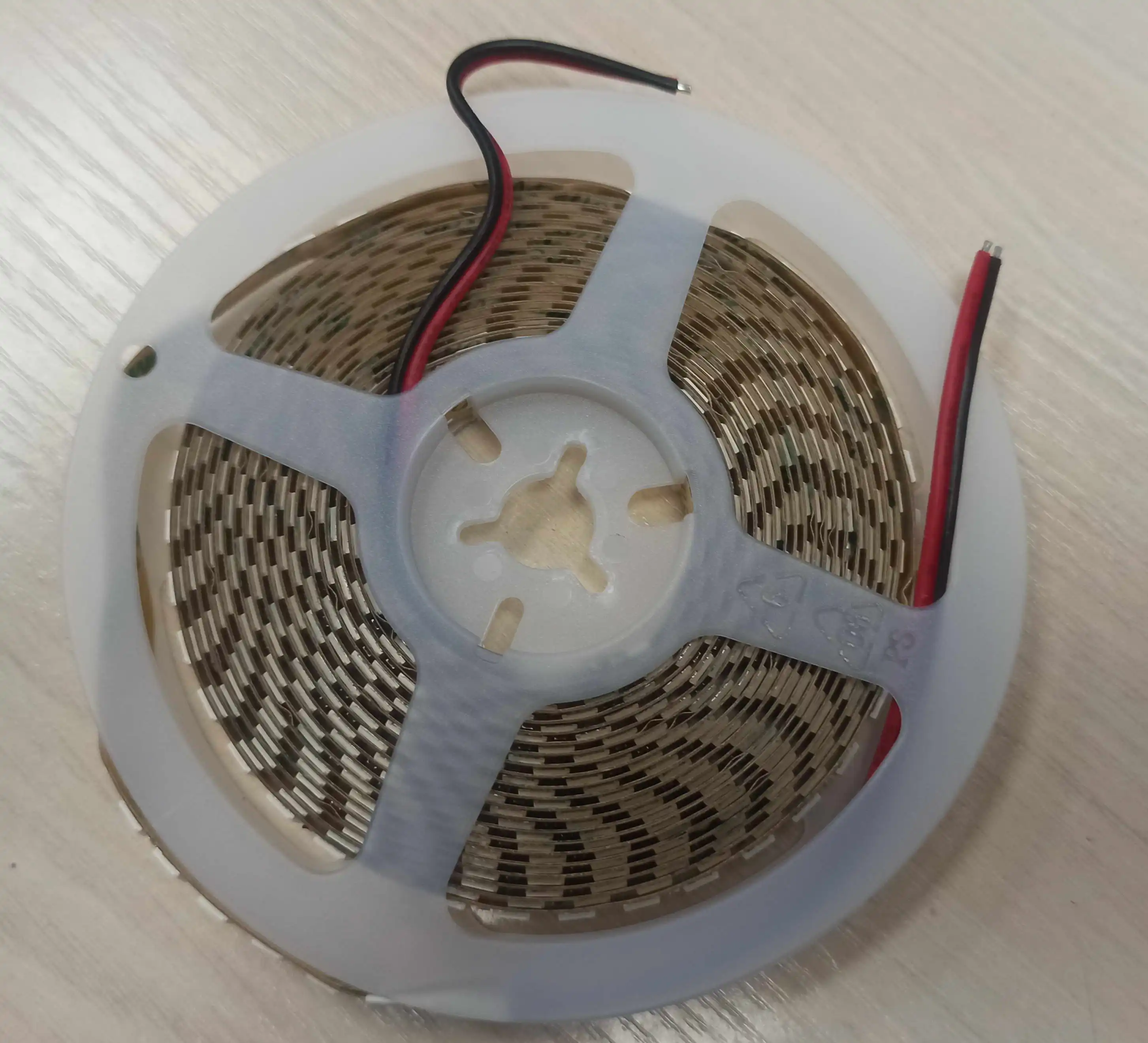 Пришло за три недели. Упаковка - пупырчатый пакет. Лента намотана на барабан. Есть помятости, но всё работает. Некоторые светодиоды наклеены криво. Такое ощущение, что их паяют вручную )) Клейкая основа ввиде двухстороннего скотча. Светит ярко. Брал вариант теплого белого