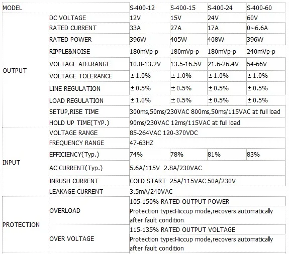 Особенности:1) высокая эффективность, низкая температура эксплуатации.2) Встроенный фильтр EMI3) 100% испытание на пригорание при полной нагрузке4) защита: перегрузка, короткое замыкание5) конкурентоспособная цена, высокая надежность6) Выход: 12 В, 15 В, 24 В, 36 В, 48 В7) Вход: 110/220В переменного тока, изменение с помощью переключателя8) Температура хранения/Влажность: 0 - 50 & deg; C / 100%, -10 & deg; C / 80%, 60 & deg; C / 60%, 20% - 90% RH9) Размеры: 215x115x50 мм
