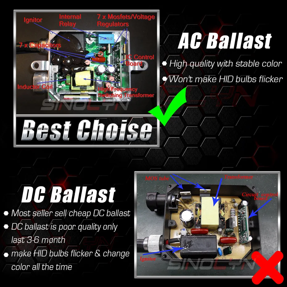 Балласты:35 Вт AC тонкие балласты, не дешевые DC балласты, что на 10 долларов дешевле, но очень короткий срок службы и сломанный после 2-3 месяца использования.
