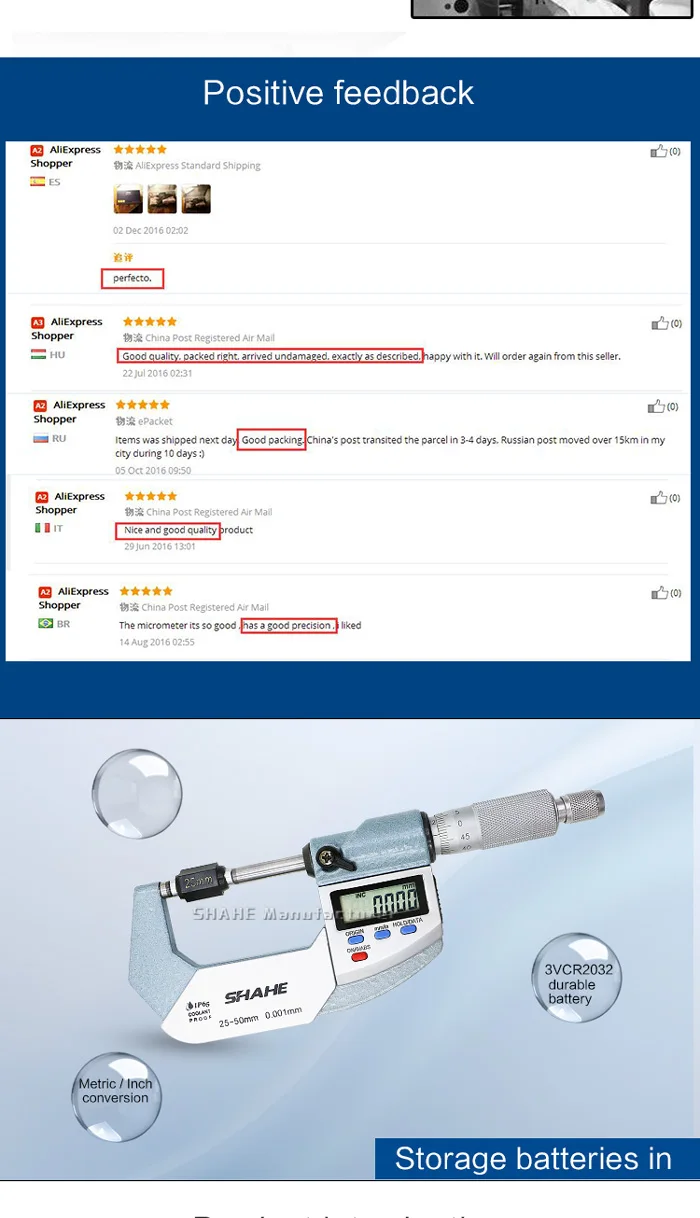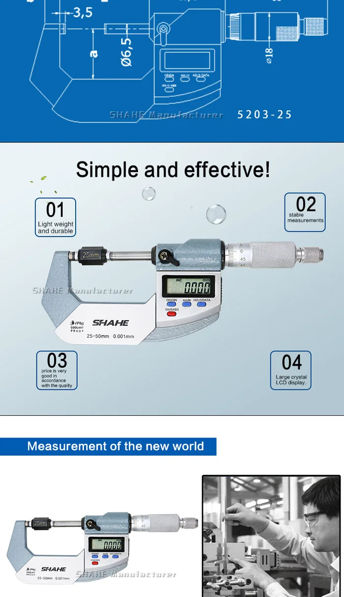 Примечание: посылка будет отправлена без аккумулятора, тип батареи-3 в CR2032 экологический литиевый аккумулятор ★Характеристика: 1. Уровень защиты ESD 2. Функция: переключатели, метрическое преобразование, нулевая Настройка в любом положении 3. Разрешение: 0,001 мм/0,00005'' 4. Быстрая реакция, отсутствие ошибки при превышении скорости 5. Высший сбой питания 6. Зонд Из Закаленного сплава 7,3 В литиевая экологическая (CR2032) 8.IP65 водонепроницаемый ★Параметры Диапазон измерения: 0-25 мм Разрешение: 0,001 мм Точность: ± 0,003 мм Диапазон измерения: 25-50 мм Разрешение: 0,001 мм Точность: ± 0,003 мм Диапазон измерения: 50-75 мм Разрешение: 0,001 мм Точность: ± 0,004 мм Диапазон измерения: 75-100 мм Разрешение: 0,001 мм Точность: ± 0,004 мм