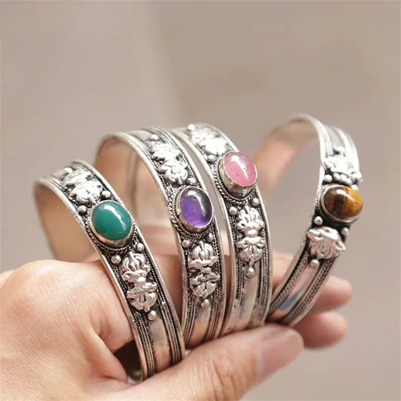 Тибетский браслет из серебра инкрустация природным камнем пробы.* Изготовлен из тибетского серебра, используется металлическое изготовление-старое ремесло, полный старинного вкуса.* Винтажный цветок и амулет Дорже с обеих сторон.* Инкрустированные различные бусины из камня, такие как