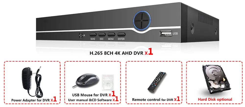 1 х H.265 8CH 4K 6 в 1 AHD DVR гибридный цифровой видеорегистратор;1 x Блок питания для DVR;1 X USB мышь для DVR;1 компакт-диск программного обеспечения для DVR;1 пульт дистанционного управления для DVR;Жесткий диск опционально!