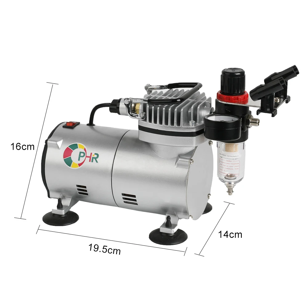Описание воздушного компрессора:Компрессор подходит для макияжа, загара, тату,Хобби/модель, рисунок ногтей, пекарня и так далее.Особенности:Датчик давления воздуха, воздушный фильтр, регулировка давления.Тип поршня; Без масла.Он может начинаться с давления, непрерывной работы, мощный.Термозащита.Низкий уровень шума, 47 дБ.Автоматическая звезда и функция автоматической остановки.Спецификация:Напряжение: 100-120 В 60 Гц/220-240 В 50 Гц (110 В штепсельная вилка стандарта США или 220 В штепсельная вилка европейского стандарта/штепсельная вилка стандарта Великобритании)Тип: поршневой компрессор с одним цилиндромМощность: 1/6 л.с.Скорость: 1450/1700р. П. МВыход воздуха в минуту/литров: 20-23 л/минАвтоматическая остановка, запуск на 3 бар (43psi), остановка на 4 бар (57psi)Диапазон регулировки давления: 0-4 барПодходит для аэрографа с насадкой: 0,2-1,0 ммРазмеры: 255x135x205ммЧистая Вес: 3,9 КГСпецификация Аэрограф (AC004):Аэрограф Двойного ДействияТип подачи: ГравитацияСопло: диаметр 0,30 ммЕмкость чашки: 7CCРабочее давление: 15-50PSIСпецификация (AC072):Аэрограф Двойного ДействияДлина корпуса: 150 ммСопло: диаметр. 0,35 ммМеталлическая чашка: 1X5CCВоздушный шланг из ПВХ: 6 футовМеталлическая Вешалка: 1 шт.Управление: кнопкаСтеклянные банки: 1X22CCГаечный ключ: 1 шт.Рабочее давление: 15-50PSIСпецификация воздушного шланга:Длина: 1,8 м1/8 "фитинг на одном конце для соединения с воздушными кистями1/8 "фитинг на одном конце для подключения с компрессорами аэрографОписание воздушного фильтра:Этот регулятор также позволяет пользователю контролировать рабочее давлениеКак помощь в очистке, сухом и регулируемом воздухе.Эксплуатация:1. Датчик отражает рабочее давление воздушных инструментов.2. Вытяните верхнюю кнопку вверх; Поверните по часовой стрелке, чтобы увеличить давление;Поверните против часовой стрелки, чтобы снять давление.3. Нажмите нижнюю иглу, чтобы выпустить воду.Посылка включает в себя:1x поршневой компрессор с одним цилиндром (110 В штепсельная вилка США или 220 В штепсельная вилка европейского стандарта/штепсельная вилка стандарта Великобритании)2x Аэрограф Комплект1x1,8 м шланг для подачи воздуха1x воздушный фильтр1x Мини-держатель аэрограф3x руководствоДля предотвращения отключения питания, пожалуйста, выберите напряжение (110 В штепсельная вилка США или 220 В штепсельная вилка ЕС), соответствующее стандарту напряжения вашей страны при покупке!Если версия не соответствует стандарту напряжения в стране, из-за которого выгорела мощность, вы несете ответственность.