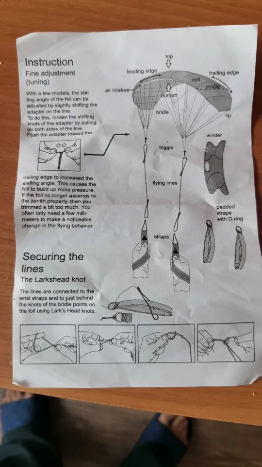 Пришло быстро .Качество не профессиональное , любительское для Кайтшколы не подойдёт, стропы на парашюте капроновая нить.