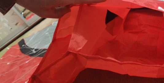 Достаточно плотная ткань. Узлы в петлях наживлены, все на разных расстояниях. Надо будет сравнить длину строп между половинками хотя б. Прошито местами безобразно, нервюры коряво вшиты. Смотрите прошивку углов воздухозаборников. Я проклеил швы и петельки смесью момент кристалл+ацетон (50/50), совсем другое дело теперь!