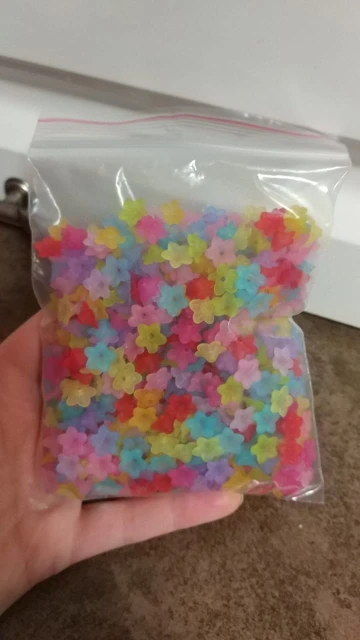 Такая прелесть эти цветочки! :) 10 цветов, количество каждого цвета - разное. Всего в упаковке было 818 штук. Все целые, бракованных нет. А еще они выглядят совсем маленькими. В это сложно поверить, но размер действительно 1 см. Как раз то, что надо. Спасибо! ♡