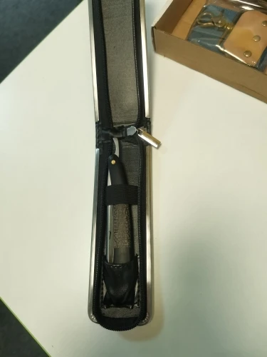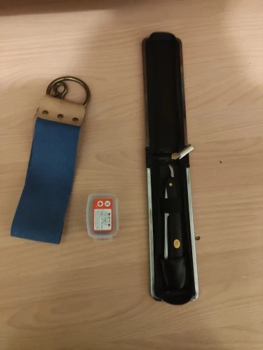 Комплект полный, в работе не проверял. Ручка дерево. Лезвие промасленно для хранения, чехол слабенький, но пойдет. На вид остроту не передашь, надо пробрвать, при тщательном осмотре, дефектов не выявленно кроме ручкимежду ручкой брусочек свободно проворачивается, а не должен, нужна проклейка. Понятно, что это не dovo, и цена крайне дешева. На подарок неискушенному может зайдет, или так попробовать, главное не разочароваться. Попробую дополню