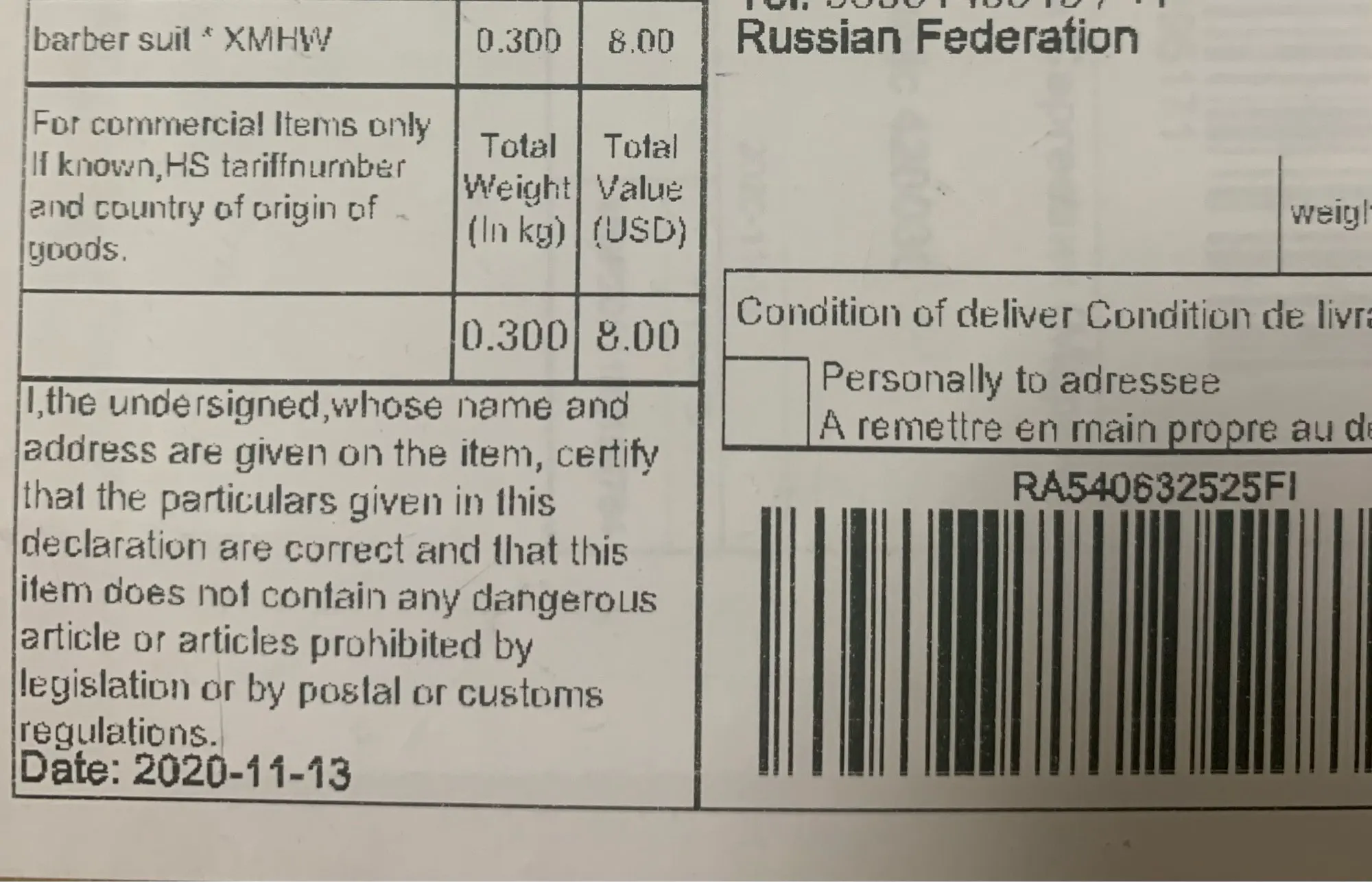 Страна: RU Color: XMHW Доставка: Cainiao Standard For Special Goods 12.11.2020